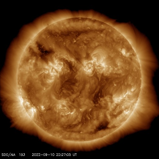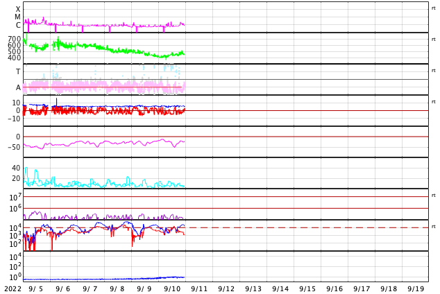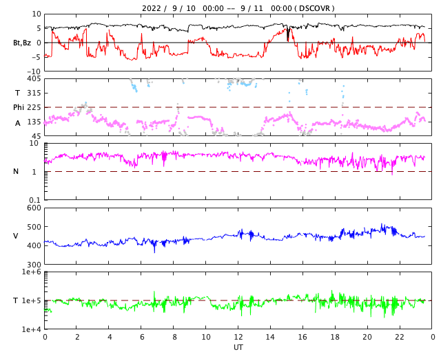 2022/ 9/11 08:47 更新 太陽風は平均的な状態です。磁気圏の活動はやや活発です。 担当 篠原 400km/秒に下がっていた太陽風の速度は、 昨日のニュース以降は少し上がって、現在は450km/秒です。 変化は小幅で、平均的な状態は続いています。 磁場強度は6nTと、こちらも平均的な状態です。 南北成分は南向き(マイナス)の変化が目立つ様になり、 -5nT程度の変化が頻繁に発生しています。 このため、磁気圏の活動は少し強まっていて、 AE指数は、500〜1000nTの中規模の変化が次々と発生しています。 SDO衛星AIA193の太陽コロナ写真では、 中心部にコロナホールは特に見られません、 太陽風は穏やかに推移しそうです。 太陽は、南東(左下)の黒点群で C1〜2の小規模フレアが度々発生するようになっています。 この後、規模が大きくなるでしょうか。 放射線帯の高エネルギー電子は、高まった状態が続いています。 太陽風が平均的な状態に戻っているので、 この後はゆっくりと減少していくでしょう。 ![]() SDO衛星のAIA193カメラによる太陽コロナの様子 (c) SDO (NASA) ![]() SDO衛星による太陽の可視光写真。マウスの矢印を写真に重ねると、黒点番号付きの写真に切り替わります。 (c) SDO (NASA) ![]() DSCOVRが観測した太陽風の磁場(黒線は全体の強度、赤線は南北成分) 磁場の向き、プラズマの密度、速度、温度 (c) データ:NOAA/SWPC、作図:宇宙天気ニュース ![]() AE指数(速報値) 下段のAEグラフの値が高くなると、オーロラ活動が活発化しています。 (c) 京都大学WDC ![]() 27日の太陽周期に合わせた図 太陽が同じ面を地球に向けていた27日前の変化から、今後を予想することができます。 (c) 作図:宇宙天気ニュース