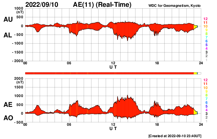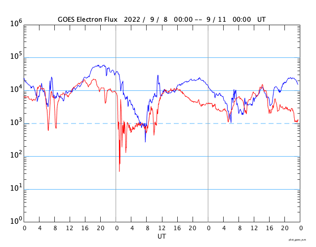 GOES衛星の太陽X線強度。赤・橙 = 0.1〜0.8 nm、青・紫 = 0.05〜0.4 nm (c) データ:NOAA/SWPC、作図:宇宙天気ニュース ![]() GOES衛星による、静止衛星軌道における高エネルギー電子 ( 2 MeV 以上 ) の変化 (c) データ:NOAA/SWPC、作図:宇宙天気ニュース ![]() | ||||||||||||||||||||||||||||||||||||||||||||||||||||||||||||||||||||||||||||||||||||||||||||||||||||||||||||||||||||||||||||||||||||||||||||||||||||||||||||||||||||||||||||||||||||||||||||||||||||||||||||||||||||||||||||||||||||