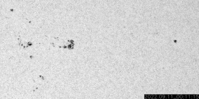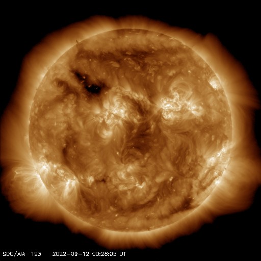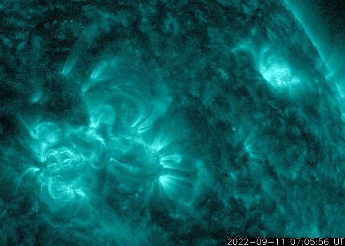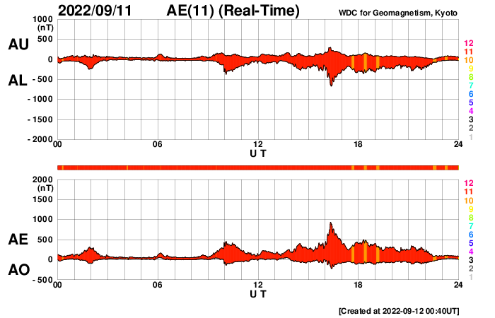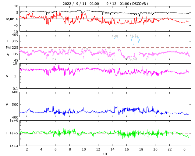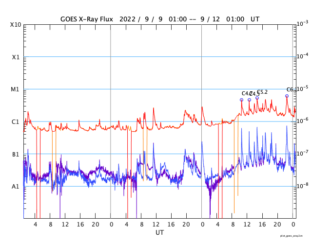 2022/ 9/12 09:58 更新 Cクラスのフレアが頻繁に発生しています。太陽風は平均的な状態です。 担当 篠原 昨日の夕方くらいから、 太陽の北西側(右上)の3098黒点群と3101黒点群の活動が高まり、 今朝、12日7時(世界時11日22時)のC6.1を最高に、 C1〜5の小規模フレアが10回程度発生しています。 1枚目にSDO衛星AIA131の動画を掲載します。 左の3098群と右の3101群で次々とフレアが発生しています。 また、2枚目は、3098群の1日間の発達の様子です。 昨日に比べて黒点が大きく目立つ様になっています。 フレアの規模も少しずつ大きくなっているので、 この後の活動に注目して下さい。 太陽風は、430km/秒と平均的な速度で安定しています。 磁場強度も、5nTと平均的な状態です。 磁場の南北成分は、南寄りの変化をしていますが、 振れ幅は小さく、 速度も下がってきたので 磁気圏の活動は規模が小さくなっています。 AE指数は、800nTの変化も起きていますが、 全体としては400nT前後の小規模の変化が続く様になっています。 SDO衛星AIA193を見ると、 北東側(左上)にコロナホールの薄暗い領域がありますが、 中心部はぼんやりと光っているだけです。 27日周期の図を見ると、 前周期は8月17日から太陽風の速度が高まっていますが、 この頃は太陽の中心部に縦に細く伸びるコロナホールがありました。 (図の上部の小さい太陽写真で見ることができます) しかし、現在はこのコロナホールは消えているので、 太陽風速度の高まりも消えている可能性があります。 明日以降、太陽風がどの様に推移するか注目して下さい。 放射線帯の高エネルギー電子は、 2機とも1万を超える状態が続いています。 ![]() 3098黒点群(左)と3101黒点群(右)の活動の様子。SDO衛星AIA131。 (c) SDO (NASA)、(動画加工 : 宇宙天気ニュース) ![]() この1日間の3098黒点群の発達の様子。SDO衛星。 (c) SDO (NASA)、(動画加工 : 宇宙天気ニュース) ![]() SDO衛星のAIA193カメラによる太陽コロナの様子 (c) SDO (NASA) ![]() SDO衛星による太陽の可視光写真。マウスの矢印を写真に重ねると、黒点番号付きの写真に切り替わります。 (c) SDO (NASA) ![]() GOES衛星の太陽X線強度。赤・橙 = 0.1〜0.8 nm、青・紫 = 0.05〜0.4 nm (c) データ:NOAA/SWPC、作図:宇宙天気ニュース ![]() DSCOVRが観測した太陽風の磁場(黒線は全体の強度、赤線は南北成分) 磁場の向き、プラズマの密度、速度、温度 (c) データ:NOAA/SWPC、作図:宇宙天気ニュース ![]() AE指数(速報値) 下段のAEグラフの値が高くなると、オーロラ活動が活発化しています。 (c) 京都大学WDC ![]() ![]() 27日の太陽周期に合わせた図 太陽が同じ面を地球に向けていた27日前の変化から、今後を予想することができます。 (c) 作図:宇宙天気ニュース