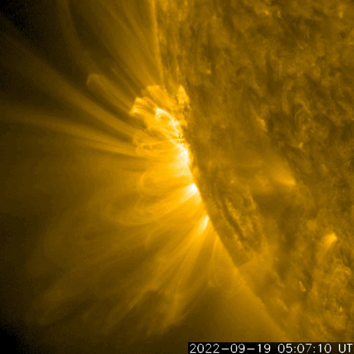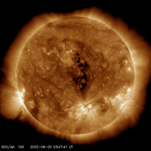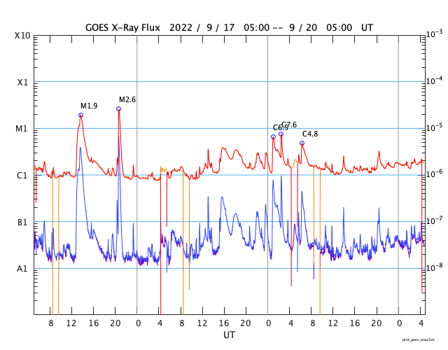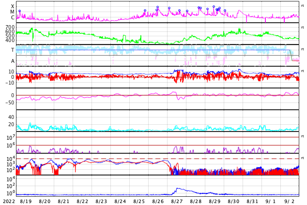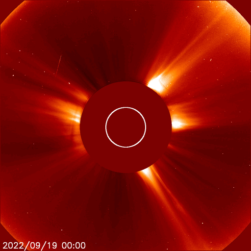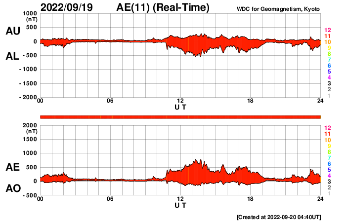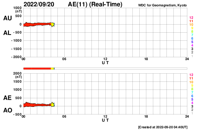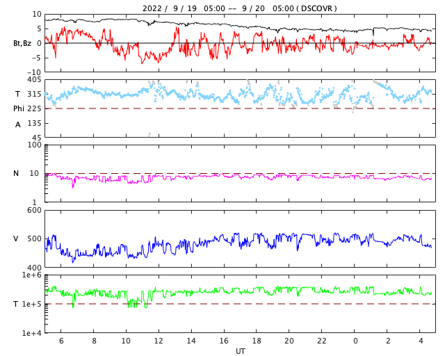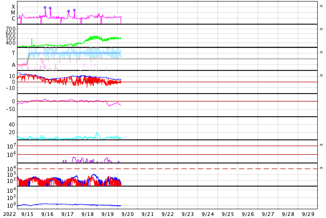 2022/ 9/20 13:56 更新 太陽の南東の端の活動が続いています。太陽風は高速です。 担当 篠原 昨日紹介した、太陽の南東の端(左下)で発生した C6.5の小規模フレアに伴って、 CME(コロナ質量放出)が発生しています。 SOHO衛星LASCO C2、C3の動画を掲載します。 C3(青)の写真ではCMEはかなり淡くなっていて、 弱いCMEだった様です。 横方向の噴出なので、地球への影響はありません。 この領域に現れた黒点には、 3105群と番号が付けられています。 この辺りをSDO衛星AIA171の動画を見ると、 ループ状のプロミネンスが次々と輝いてとてもきれいです。 この様子だと、3105群の向こう側にも活動的な領域がある様です。 この後、新しい黒点が現れるのかもしれません。 注目して下さい。 また、太陽中心部南側の3102群でも、 C1〜2の小規模フレアが発生しています。 太陽風は、昨日のニュースの後、 450km/秒に速度が下がりましたが、 再び500km/秒に高まって、高速の状態が続いています。 磁場強度は、8nTから5nTへ下がっていて、 平均的な状態です。 磁場の南北成分は、 グラフの前半は南北に繰り返し変化が発生していますが、 後半は0nT付近で小さくなっています。 このため、AE指数も、 グラフの中盤で500nT前後の中規模の変化が発生していますが、 後半は静かになっています。 SDO衛星AIA193の太陽コロナ写真では、 中心部のコロナホールが少し西に進んでいます。 明後日くらいに地球へ影響が始まる目安の位置に達しますが、 その前に太陽風の速度は一旦下がるか、高速の状態が続くか、 どの様に推移するでしょうか。 ニュースの運用が無事に回復しました。 グラフの更新やフレアの速報メールなども再開しています。