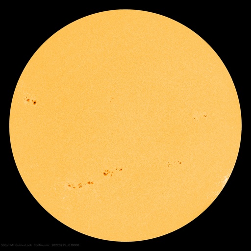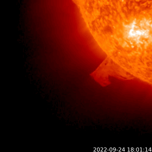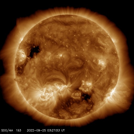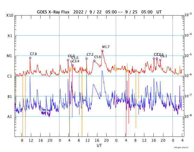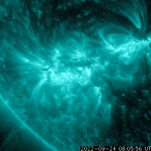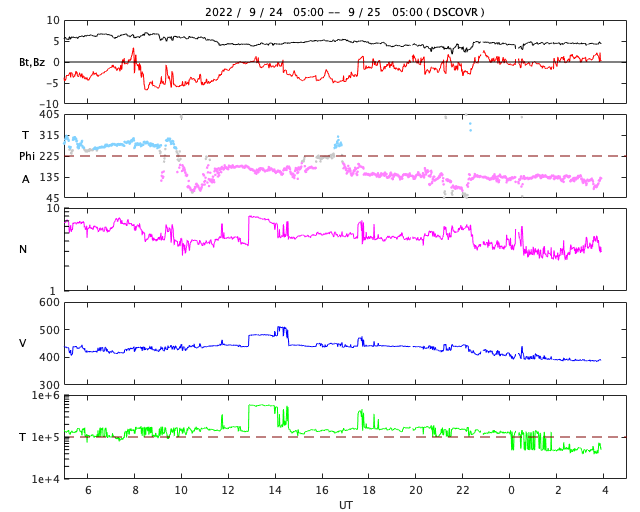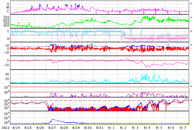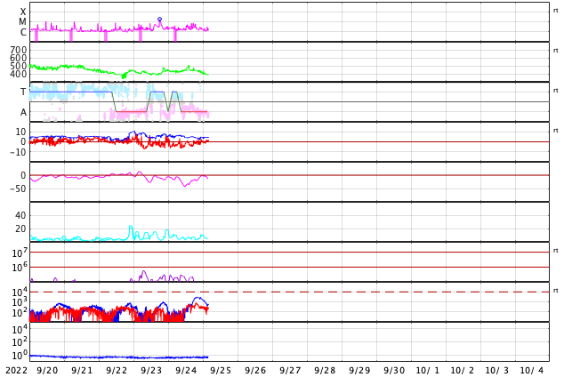2022/ 9/25 13:07 更新 Cクラスのフレアが頻繁に発生しています。太陽風はやや低速です。 担当 篠原 太陽は、南東(左下)の3107黒点群と、 北東(左上)の3110群でフレアの発生が続いています。 25日1時(世界時24日16時)に3107群でC7.2、 3110群では、25日2時(世界時24日17時)にC7.2、 25日3時班(世界時25日18時班)にC6.1など、 小規模フレアが次々と発生しています。 3107群の活動の様子を、 SDO衛星AIA131の動画で紹介します。 3110群でも同様の活動が発生しています。 引き続き、フレアの発生に注目して下さい。 また、太陽の南東の端で、 今朝、25日5時(世界時24日20時)頃から、 プロミネンス噴出が発生しています。 GOES衛星SUVI 304の動画を掲載します。 巨大なコロナの帯が宇宙空間へ飛び出しています。 SOHO衛星LASCO C2では、 CME(コロナ質量放出)が観測されています。 地球に対しては横方向の噴出なので、影響はありません。 LASCO C2では、昨夕、24日17時(世界時24日8時)頃にも、 太陽の右下に飛び出すCMEが撮影されていますが、 これは、太陽の向こう側の現象の様です。 太陽風は、速度が430km/秒から390km/秒へ下がり、 やや低速になっています。 磁場強度は、5nT前後で平均的な状態です。 磁場の南北成分は、南寄りから0nT付近に傾向が変化しています。 このため、磁気圏の活動は次第に穏やかになり、 AE指数は、途中まで500nT程度の中規模の変化が発生していますが、 最後は変化がなくなって、静かになっています。 SDO衛星AIA193では、 南半球のコロナホールが南西側(右下)に進んでいます。 緯度が高めですが、この後どの程度の影響がやって来るでしょうか。