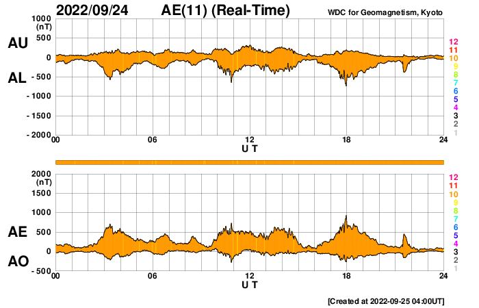 (c) SDO (NASA)、(動画加工 : 宇宙天気ニュース) ![]() 太陽の南西端で発生したプロミネンス噴出。GOES衛星SUVI 304。 (c) GOES (NOAA)、(動画加工 : 宇宙天気ニュース) ![]() SDO衛星のAIA193カメラによる太陽コロナの様子 (c) SDO (NASA) ![]() SDO衛星による太陽の可視光写真。マウスの矢印を写真に重ねると、黒点番号付きの写真に切り替わります。 (c) SDO (NASA) ![]() GOES衛星の太陽X線強度。赤・橙 = 0.1〜0.8 nm、青・紫 = 0.05〜0.4 nm (c) データ:NOAA/SWPC、作図:宇宙天気ニュース ![]() DSCOVRが観測した太陽風の磁場(黒線は全体の強度、赤線は南北成分) 磁場の向き、プラズマの密度、速度、温度 (c) データ:NOAA/SWPC、作図:宇宙天気ニュース ![]() AE指数(速報値) 下段のAEグラフの値が高くなると、オーロラ活動が活発化しています。 (c) 京都大学WDC ![]() ![]() 27日の太陽周期に合わせた図 太陽が同じ面を地球に向けていた27日前の変化から、今後を予想することができます。 (c) 作図:宇宙天気ニュース