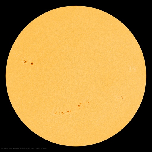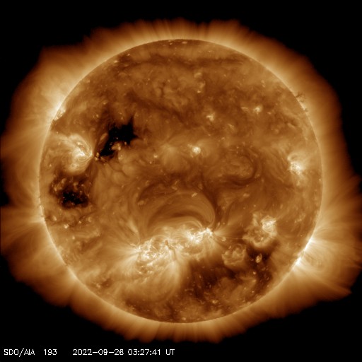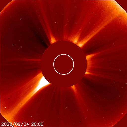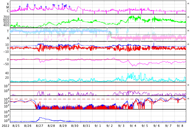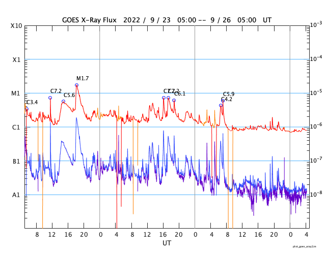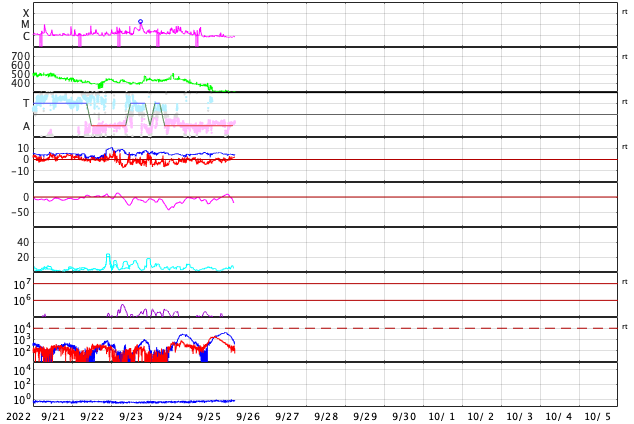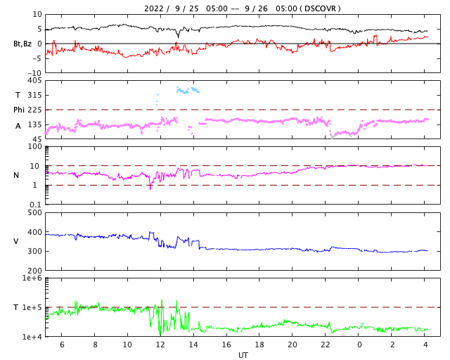2022/ 9/26 13:25 更新 フレアの発生は少なくなっています。太陽風は低速です。 担当 篠原 昨日紹介したプロミネンス噴出の後のCME(コロナ質量放出)の様子を、 SOHO衛星LASCO C2、C3の動画で紹介します。 太陽から左下に向かって、コロナのガスが飛び出しています。 地球に対しては横方向の噴出なので、影響はないでしょう。 動画の中のC3の青の写真では、 先日紹介した様に、 明るく輝く金星が、写真の右端から左に向かって進んでいます。 また、暗いので見つけにくいですが、 太陽の右下では、 地球と太陽の間を通り過ぎた水星が、右へ向かって進んでいます。 背景の恒星たちよりも少し速く動いているのですが、 見つけられるでしょうか。 太陽は、昨日の午後、 25日15時(世界時25日6時)に3107群でC4.2、 25日16時(世界時25日7時)に3110群でC5.9 の小規模フレアが発生していますが、 以降はC1の小さい変化が発生している程度です。 活動は落ちつている様です。 太陽風は、380km/秒から300klm/秒へ速度が下がり、 低速の風になっています。 磁場強度は5nT前後で平均的な状態です。 太陽の南西(右下)に進んでいるコロナホールの影響は来ていません。 これからやって来るのか、影響は来ないままなのか、 引き続き変化に注目してください。 磁気圏は穏やかで、 AE指数は、後半から変化がなくなっています。 SDO衛星AIA193では、 太陽の北東側(左上)に次のコロナホールが見えています。 このコロナホールは、 形は変化していますが27日前にも見えていて、 27日周期の図を見ると、 9月3日から太陽風速度の高まりが始まっています。 27日後と考えると、 今回は4日後の30日くらいに変化が始まるかもしれません。 昨日で夏休みが終わり、 今日から学校がにぎやかになっています。 新型コロナの休校などの関係で、 今週は前期の最後の授業、来週から後期が始まります。 久しぶりの授業は、緊張します。 ![]() 昨日、太陽の左下に噴出したCME。SOHO衛星LASCO C2、C3。 (c) SOHO (ESA & NASA)、 (動画加工 : 宇宙天気ニュース) ![]() SDO衛星のAIA193カメラによる太陽コロナの様子 (c) SDO (NASA) ![]() SDO衛星による太陽の可視光写真。マウスの矢印を写真に重ねると、黒点番号付きの写真に切り替わります。 (c) SDO (NASA) ![]() GOES衛星の太陽X線強度。赤・橙 = 0.1〜0.8 nm、青・紫 = 0.05〜0.4 nm (c) データ:NOAA/SWPC、作図:宇宙天気ニュース ![]() DSCOVRが観測した太陽風の磁場(黒線は全体の強度、赤線は南北成分) 磁場の向き、プラズマの密度、速度、温度 (c) データ:NOAA/SWPC、作図:宇宙天気ニュース ![]() AE指数(速報値) 下段のAEグラフの値が高くなると、オーロラ活動が活発化しています。 (c) 京都大学WDC ![]() ![]() 27日の太陽周期に合わせた図 太陽が同じ面を地球に向けていた27日前の変化から、今後を予想することができます。 (c) 作図:宇宙天気ニュース