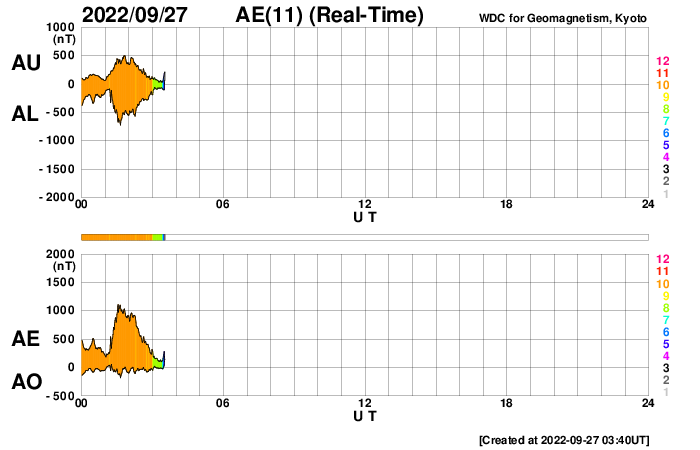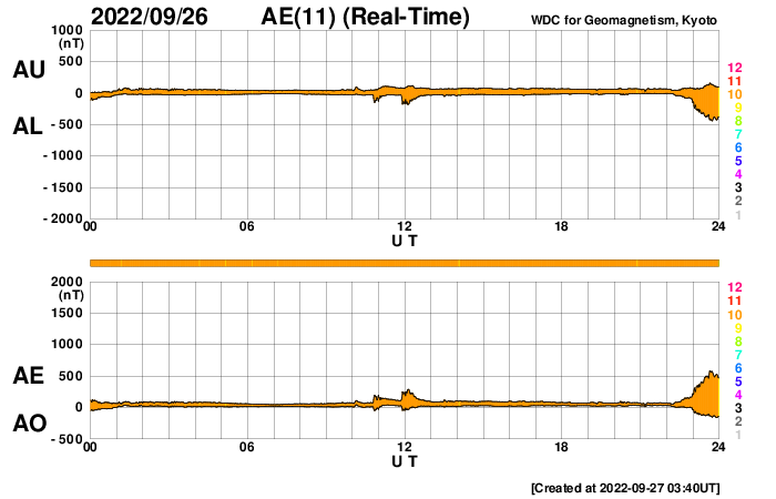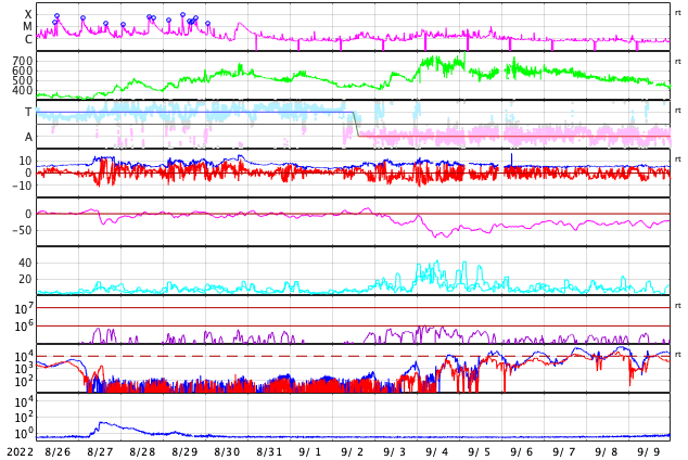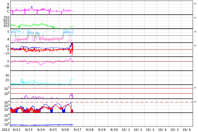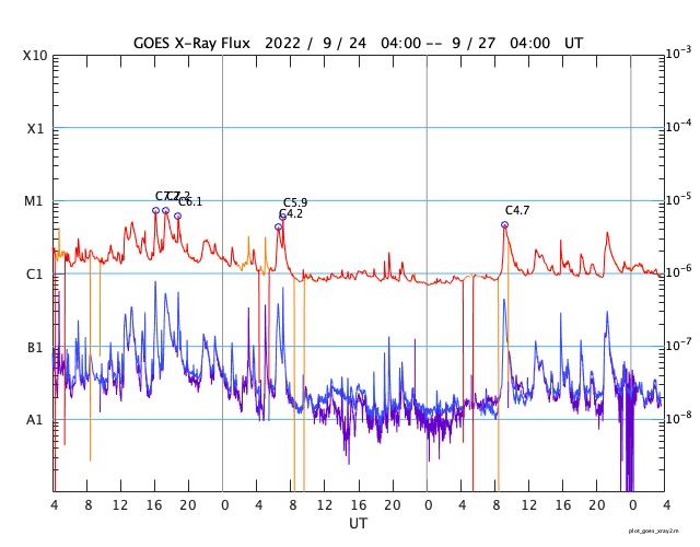 GOES衛星の太陽X線強度。赤・橙 = 0.1〜0.8 nm、青・紫 = 0.05〜0.4 nm (c) データ:NOAA/SWPC、作図:宇宙天気ニュース ![]() | ||||||||||||||||||||||||||||||||||||||||||||||||||||||||||||||||||||||||||||||||||||||||||||||||||||||||||||||||||||||||||||||||||||||||||||||||||||||||||||||||||||||||||||||||||||||||||||||||||||||||||||||||||||||||||||||||||||||||||||||||||||||