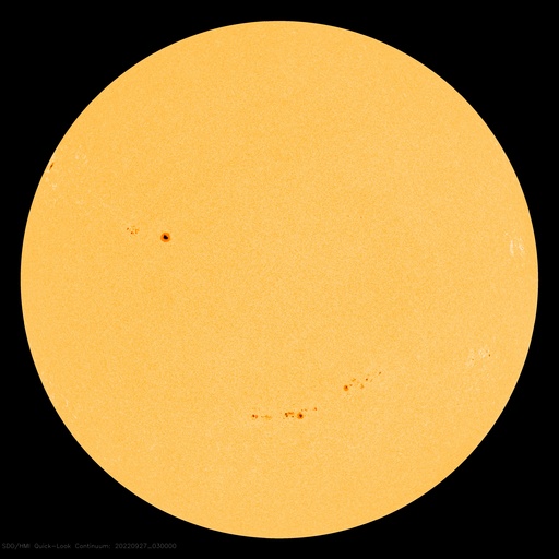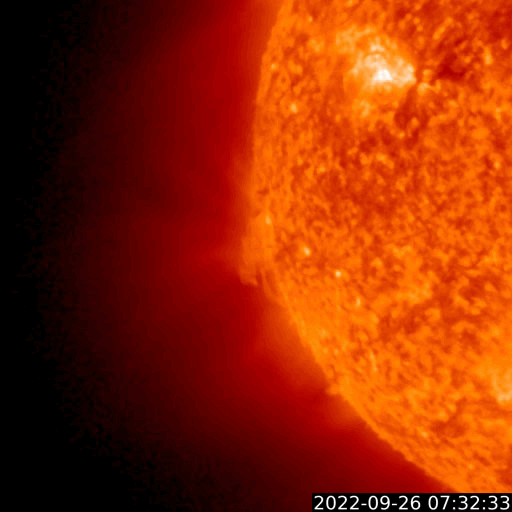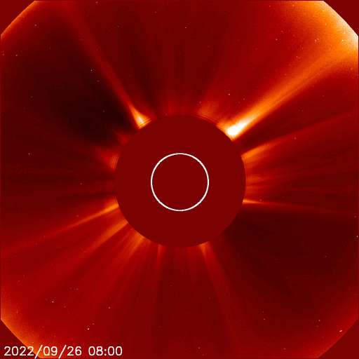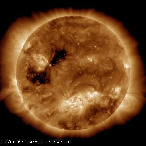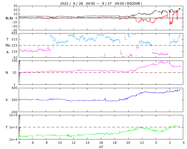 2022/ 9/27 12:49 更新 太陽風の磁場が強まっています。速度は低速です。 担当 篠原 今朝、27日6時(世界時26日21時)頃から、 太陽風の磁場強度が強まり始め、 3nTとやや弱い状態から次第に上昇して、 27日11時(世界時27日2時)頃に21nTに達しました。 その後は16nT前後で推移し、 グラフの最後で再び23nTに強まっています。 速度も同じ頃に上昇していますが、 ここまでは変化は小幅で、 300km/秒から380km/秒に高まった程度と、 低速の状態が続いています。 今後どの様に変化するか、引き続き注目してください。 太陽風のグラフでは、 磁場強度も速度も急な強まりは見られず、 数時間かけてゆっくりと強まっています。 CMEによる乱れというより、 太陽風の大きい構造に関係する乱れなのかもしれません。 磁場の南北成分は、 -10nTに達する南向きの大きい変化が発生して、 AE指数では500〜1000nTの中規模の変化が発生しています。 速度が低速なので、激しい変化にはなっていない様です。 SDO衛星AIA193では、 太陽の東側にコロナホールの暗い領域が広がっていて、 右端が太陽の中心線に達するくらいです。 このため、3日後くらいから、 この領域の影響で太陽風の速度が高まる可能性があります。 太陽は、中心部南側(下)の3107黒点群で、 C4.7、C3.6などの小規模フレアが発生しています。 SDO衛星AIA131の動画の様子では、 特に活発という印象ではありません。 昨夕、26日18時(世界時26日9時)頃に、 太陽の南東の端(左下)で、プロミネンス噴出が発生しました。 GOES衛星SUVI 304の動画を掲載します。 この写真では特に目立つ現象ではなかったのですが、 SOHO衛星LASCO C2、C3では なかなか立派なCMEの噴出が観測されていて、 コロナのガスの広がり方がきれいに見えています。 横方向の噴出なので、地球への影響はありません。 ![]() 太陽の南東で発生したプロミネンス噴出。GOES衛星SUVI 304。 (c) GOES (NOAA)、(動画加工 : 宇宙天気ニュース) ![]() 太陽の左下に向かって飛び出すCME。SOHO衛星LASCO C2、C3。 (c) SOHO (ESA & NASA)、 (動画加工 : 宇宙天気ニュース) ![]() SDO衛星のAIA193カメラによる太陽コロナの様子 (c) SDO (NASA) ![]() SDO衛星による太陽の可視光写真。マウスの矢印を写真に重ねると、黒点番号付きの写真に切り替わります。 (c) SDO (NASA) ![]() DSCOVRが観測した太陽風の磁場(黒線は全体の強度、赤線は南北成分) 磁場の向き、プラズマの密度、速度、温度 (c) データ:NOAA/SWPC、作図:宇宙天気ニュース ![]() AE指数(速報値) 下段のAEグラフの値が高くなると、オーロラ活動が活発化しています。 (c) 京都大学WDC ![]() ![]() 27日の太陽周期に合わせた図 太陽が同じ面を地球に向けていた27日前の変化から、今後を予想することができます。 (c) 作図:宇宙天気ニュース