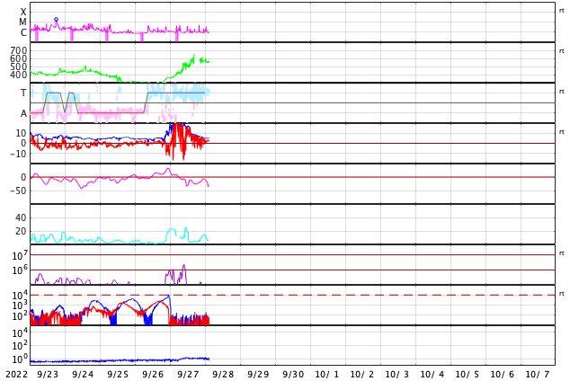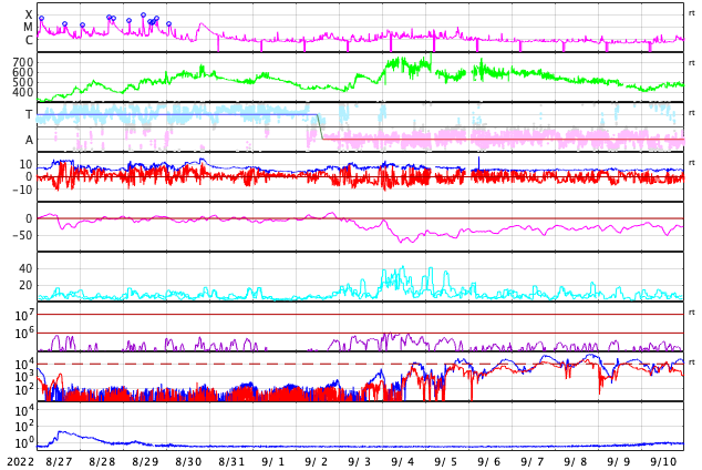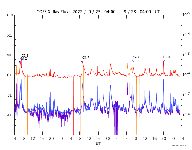 GOES衛星の太陽X線強度。赤・橙 = 0.1〜0.8 nm、青・紫 = 0.05〜0.4 nm (c) データ:NOAA/SWPC、作図:宇宙天気ニュース ![]() | ||||||||||||||||||||||||||||||||||||||||||||||||||||||||||||||||||||||||||||||||||||||||||||||||||||||||||||||||||||||||||||||||||||||||||||||||||||||||||||||||||||||||||||||||||||||||||||||||||||||||||||||||||||||||||||||||||||||||||||||||||||||||||||||