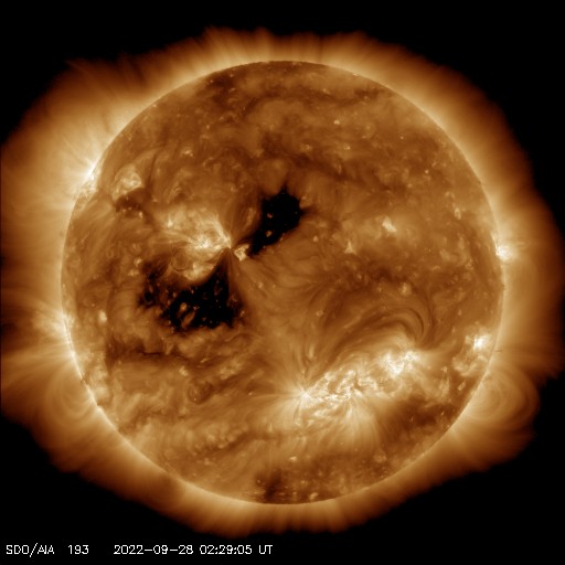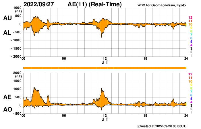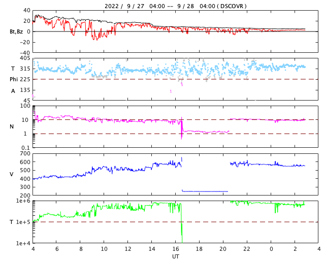 2022/ 9/28 12:03 更新 太陽風は高速になっています。磁気圏は穏やかです。ニュージーランドのオーロラをどうぞ。 担当 篠原 写真を送っていただいてから掲載が遅れてしまったのですが、 ニュージーランド南島クィーンズタウンの米戸 実さんより、 世界時23日9時頃に撮影されたオーロラの写真をいただきました。 当時の状況は、9月24日のニュースで見ることができます。 太陽風は400km/秒と平均的な速度でしたが、 磁場が南向きに強まって、-8nTに達する変化が到来しています。 この影響で磁気圏の活動もやや強まって、 AE指数は700nTの中規模の変化が発生しました。 しかし、特に目立つ規模の乱れではなく、 米戸さんもあまり期待せずに撮影に向かったとのことです。 ところが、赤いオーロラは思ったよりも大きく、 南十字を飲み込むくらいに広がっていたとのことです。 南十字は、写真のほぼ中心で右下に傾いて見えていて、 ここまで赤い光が広がっています。 すぐ上にコールサック(石炭袋)と呼ばれる暗い領域が見えています。 右上に伸びる天の川がとてもきれいです。 湖面まで真っ赤に染まって、美しい光景です。 天の川の見え方も圧倒的ですね。 どうもありがとうございます。 太陽風は、昨日のニュースで磁場の強まりをお知らせしましたが、 夕方から速度も上昇を始めて、500km/秒に達して高速風になり、 深夜には570km/秒にまで高まりました。 現在は少し下がっていますが、 550km/秒と高速の状態が続いています。 太陽風の磁場強度は、ニュースの後に30nTまで強まりましたが、 速度が上がり始めると低下に向かい、 現在は5nTと平均的な値に戻っています。 今日のSDO衛星AIA193では見にくくなっていますが、 南半球に広がっていたコロナホールの影響がやって来た様です。 磁場の南北成分は、北向きの時間が長くなっています。 このため、磁気圏は静かな時間帯が長くなっていて、 磁場が時々南を向いた頃に、変化が発生する状態になっています。 太陽風速度の高まりは、これからどのくらい続くでしょうか。 SDO衛星AIA193では、北半球のコロナホールが中心線を越えていて、 明後日くらいからは、こちらの影響も始まる可能性があります。 太陽は、南西(右下)の3105、3107黒点群で、 C1〜4の小規模フレアが10回程度、次々に発生しています。