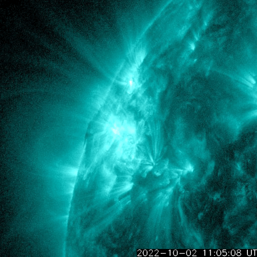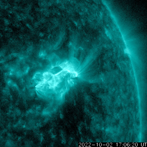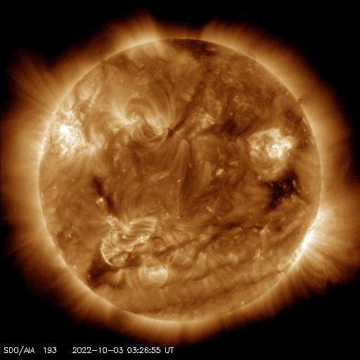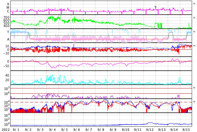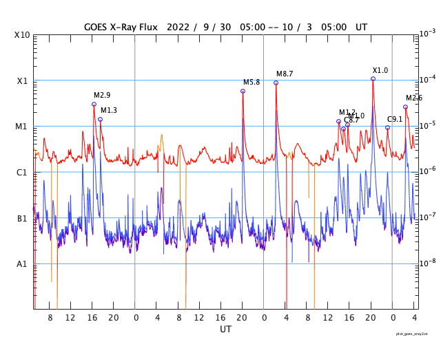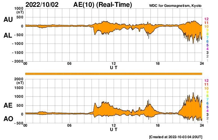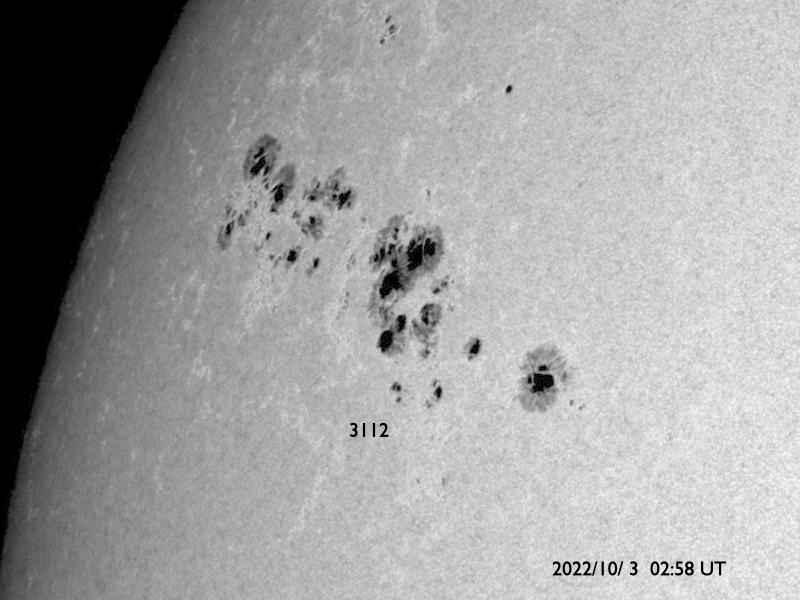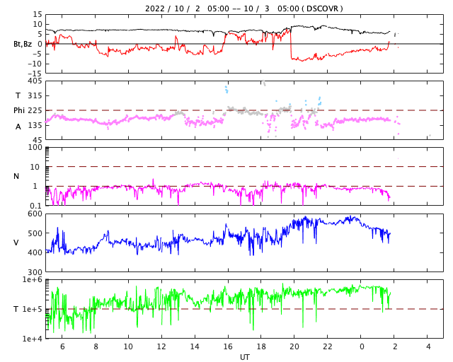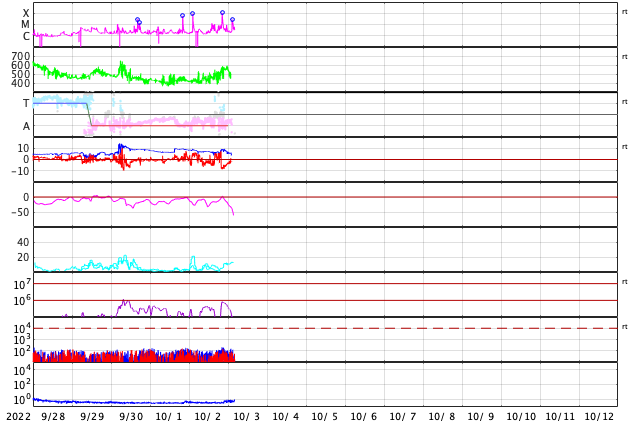 2022/10/ 3 13:23 更新 X1.0の大規模フレアが発生しました。太陽風は高速になり、磁気圏も活動的です。 担当 篠原 今朝、3日5時(世界時2日20時)に、 太陽の北西側(右上)の3110黒点群で、 X1.0の大規模フレアが発生しました。 SDO衛星AIA131による動画を掲載します。 3110群は、昨日の朝と昼に、 M5.8とM8.7の中規模フレアを起こしましたが、 それに続く大きい活動となりました。 Xクラスのフレアの発生は、 5月10日のX1.5以来で、5か月ぶりです。 このフレアに伴って、 太陽の右上に向かってCME(コロナ質量放出)が発生しています。 SOHO衛星LASCO C2、C3の動画を掲載します。 地球に対しては斜め方向なので、影響は小さそうです。 また、太陽の北東(左上)の3112群でも、 昨夜遅くから今朝にかけて、 M1.2、M1.0、C8.1、C9.1と小・中規模のフレアが続き、 先ほど、3日11時半(世界時3日2時半)には、 M2.6の中規模フレアが発生しました。 一連の活動の様子を、SDO衛星AIA131の動画にまとめます。 3112群の拡大写真を掲載します。 黒点群は、東西に大きく広がっています。 この後も活動に注目して下さい。 太陽風は、昨日のニュース以降速度が高まって行き、 今朝早くに500km/秒に達して高速風になりました。 その後、580km/秒まで高まりましたが、 グラフの最後では500km/秒に少し下がっています。 太陽風の磁場強度は、 7nTに少し強まった状態から、一時的に9nTに強まり、 その後は下がって、現在は5nTと平均的な状態に戻っています。 南北成分は、南向きに傾向が変わり、 -9nTに達する南向きの強まりも発生しています。 このため磁気圏の活動は活発になり、 AE指数はグラフの途中から変化が大きくなって、 500〜1200nTの中・大規模の変化が続く様になっています。 SDO衛星AIA193の太陽コロナ写真では、 コロナホールは西の端近くに進んでいます。 速度の高まりはどのくらい続くでしょうか。