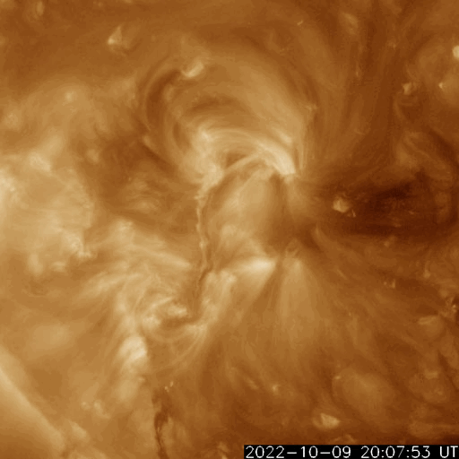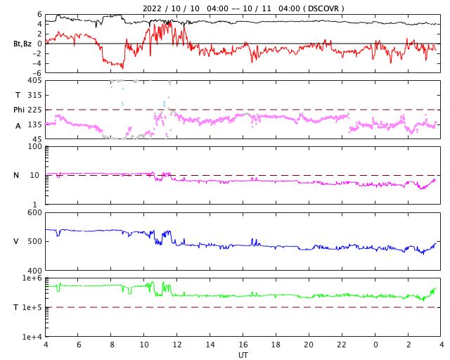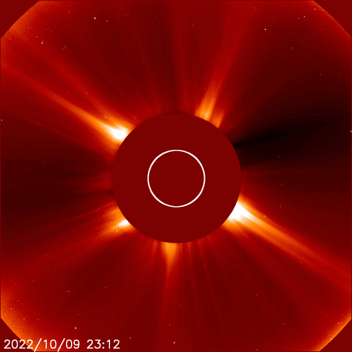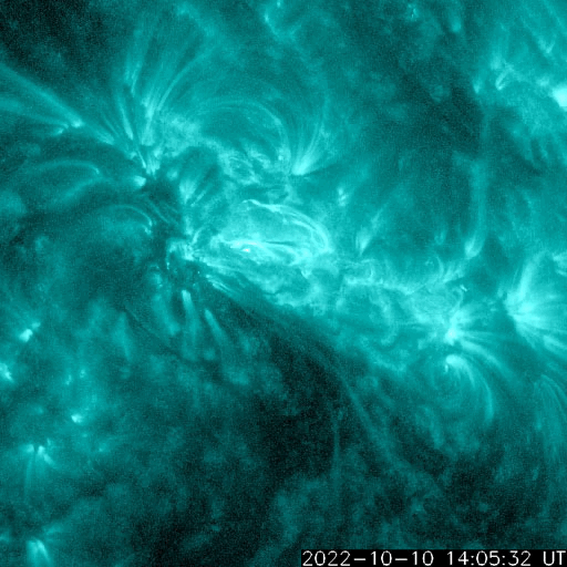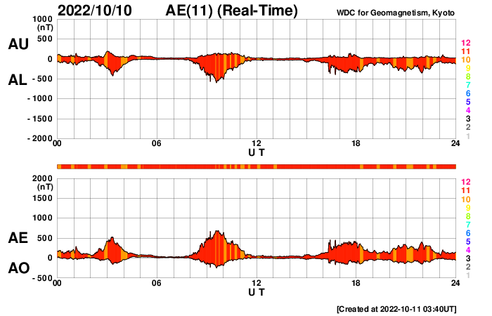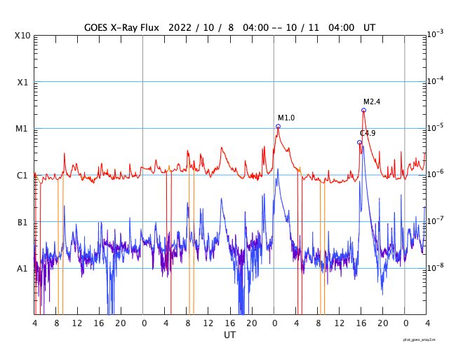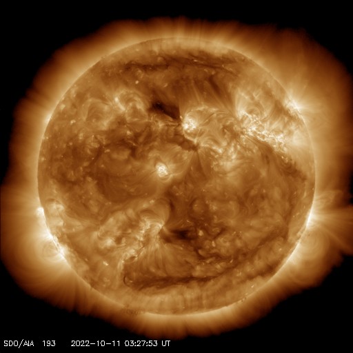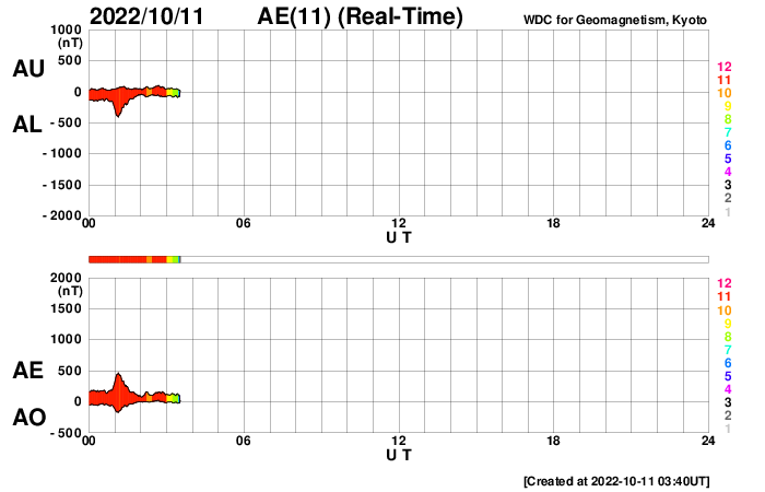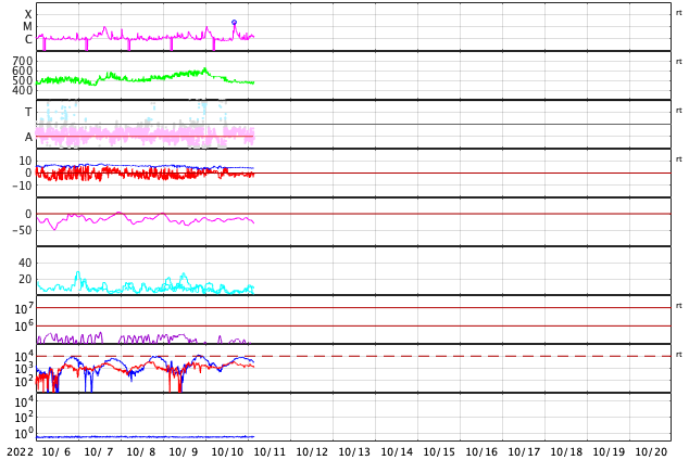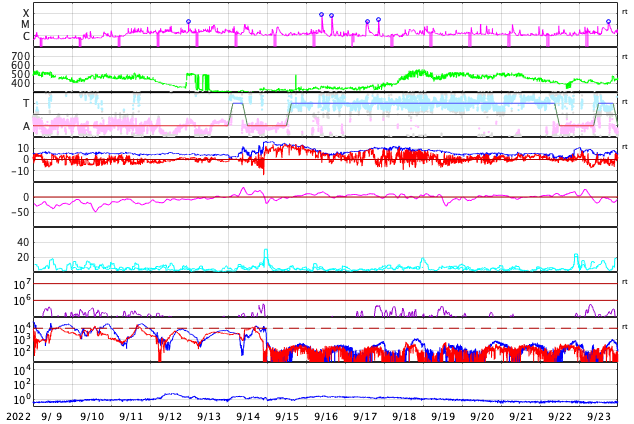 2022/10/11 12:58 更新 M2.4の中規模フレアが発生しました。太陽風はやや高速に下がっています。 担当 篠原 深夜の11日1時(世界時10日16時)に、 太陽の北西(右上)の3112黒点群で、 M2.4の中規模フレアが発生しました。 3112群では、昨日の朝にもM1.0の中規模フレアが発生していて、 それに続くMフレアです。 SDO衛星AIA131の動画を掲載します。 SOHO衛星の画像では、 CME(コロナ質量放出)は見つけられませんでした。 太陽では、中心部北側(上)の3119群でも C1〜3の小規模フレアが発生しています。 また、昨日の朝ですが、 10日9時(世界時10日0時)頃に、 太陽の南東(左下)に向かってCMEが飛び出しました。 SOHO衛星LASCO C2、C3の動画を掲載します。 昨日のニュースでも同じ様な動画を掲載しましたが、 違う現象です。 SDO衛星AIA193を見ると(3枚目の動画)、 太陽の南東側で小規模の爆発現象が発生していた様です。 タイミングや位置が合っているので、 CMEはこの現象に関係しているのかもしれません。 その場合、こちら側の噴出なので、 2〜3日後(発生から3〜4日後)くらいに、 太陽風磁場の強まりなどが到来するかもしれません。 小規模の変化だと思いますが、やって来るでしょうか。 太陽風は、速度が540km/秒から480km/秒に下がり、 やや高速くらいになっています。 高速風は終わりが近いのかもしれません。 磁場強度は、4nT前後です。 南北成分は弱い南寄りになっていて、 AE指数は小規模の変化が発生しています。 SDO衛星AIA193では、 太陽の北側に小さいコロナホールが見える程度です。 太陽風は穏やかになりそうですが、どうでしょうか。 ![]() 3112群で発生したM2.4の中規模フレア。SDO衛星AIA131。 (c) SDO (NASA)、(動画加工 : 宇宙天気ニュース) ![]() 太陽の南東に飛び出すCME。SOHO衛星LASCO C2、C3。 (c) SOHO (ESA & NASA)、 (動画加工 : 宇宙天気ニュース) ![]() 太陽の南東側で発生した現象。SDO衛星AIA193。 (c) SDO (NASA)、(動画加工 : 宇宙天気ニュース) ![]() SDO衛星のAIA193カメラによる太陽コロナの様子 (c) SDO (NASA) ![]() SDO衛星による太陽の可視光写真。マウスの矢印を写真に重ねると、黒点番号付きの写真に切り替わります。 (c) SDO (NASA) ![]() GOES衛星の太陽X線強度。赤・橙 = 0.1〜0.8 nm、青・紫 = 0.05〜0.4 nm (c) データ:NOAA/SWPC、作図:宇宙天気ニュース ![]() DSCOVRが観測した太陽風の磁場(黒線は全体の強度、赤線は南北成分) 磁場の向き、プラズマの密度、速度、温度 (c) データ:NOAA/SWPC、作図:宇宙天気ニュース ![]() AE指数(速報値) 下段のAEグラフの値が高くなると、オーロラ活動が活発化しています。 (c) 京都大学WDC ![]() ![]() 27日の太陽周期に合わせた図 太陽が同じ面を地球に向けていた27日前の変化から、今後を予想することができます。 (c) 作図:宇宙天気ニュース