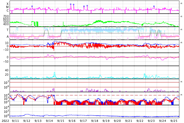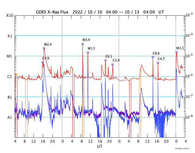 GOES衛星の太陽X線強度。赤・橙 = 0.1〜0.8 nm、青・紫 = 0.05〜0.4 nm (c) データ:NOAA/SWPC、作図:宇宙天気ニュース ![]() | |||||||||||||||||||||||||||||||||||||||||||||||||||||||||||||||||||||||||||||||||||||||||||||||||||||||||||||||||||||||||||||||||||||||||||||||||||||||||||||||||||||||||||||||||||||||||||||||||||||||||||||||||||||||||||||||||||||||||||||||||||||||||||||||||||||||||||||||