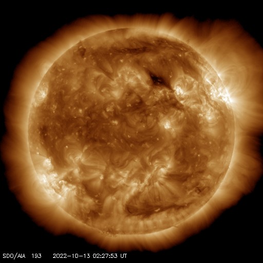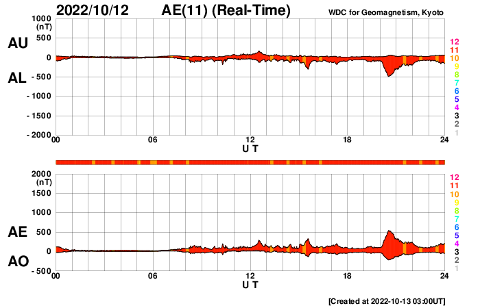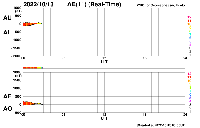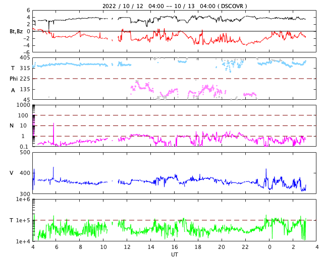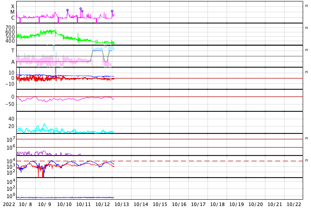 2022/10/13 12:17 更新 太陽風の速度は更に下がり、低速になっています。 担当 篠原 太陽風の速度は380km/秒から330km/秒程度へ下がり、 より低速の風になっています。 磁場強度は3nT前後とやや弱い状態です。 太陽風は穏やかになっています。 磁場の南北成分は、弱い南向きになっています。 速度が下がっているので、 磁気圏は少し活動的になった程度で、 AE指数は小さい変化が長く続いて、 途中で500nTの変化が1回発生しています。 SDO衛星AIA193では、 北西側(右上)に小さいコロナホールが見える程度で、 太陽風は穏やかな状態が続きそうです。 太陽は、北西に進んだ3112黒点群で、 今朝、13日9時(世界時13日0時)に M1.5の中規模フレアが発生しました。 3112群では、夜の間に、C8.8、C4.7の 小規模フレアも発生しています。 X線グラフとしては、変化が少なくなっていて、 3112群の活動度は下がっている様です。 太陽の東側(左側)には、小さい黒点が現れていますが、 3112群が沈んだ後は、太陽は穏やかになりそうです。