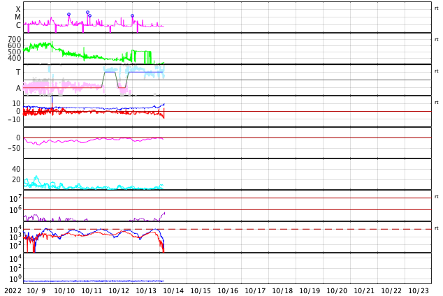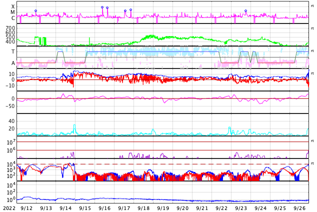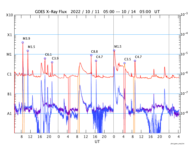 GOES衛星の太陽X線強度。赤・橙 = 0.1〜0.8 nm、青・紫 = 0.05〜0.4 nm (c) データ:NOAA/SWPC、作図:宇宙天気ニュース ![]() | ||||||||||||||||||||||||||||||||||||||||||||||||||||||||||||||||||||||||||||||||||||||||||||||||||||||||||||||||||||||||||||||||||||||||||||||||||||||||||||||||||||||||||||||||||||||||||||||||||||||||||||||||||||||||||||||||||||||||||||||||||||||||||||||||