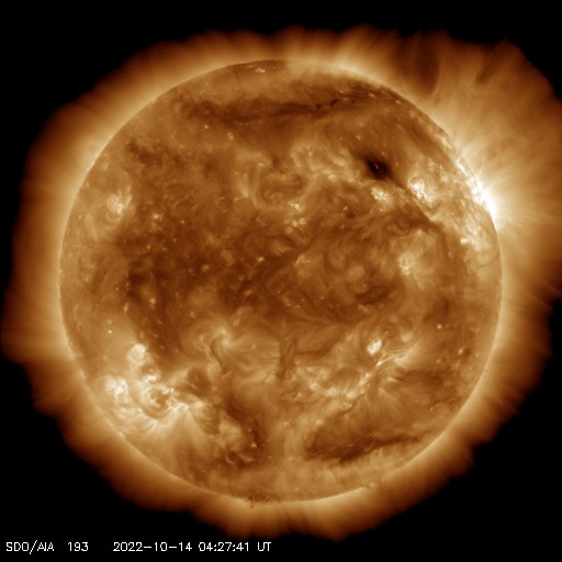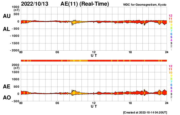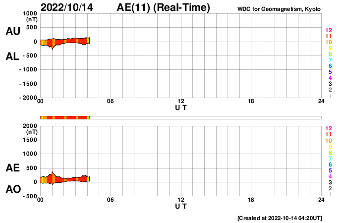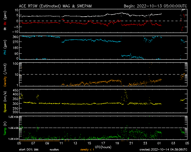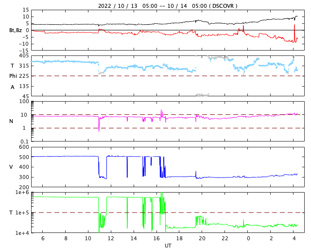 2022/10/14 13:40 更新 太陽風は低速の状態です。太陽風磁場が強まっています。 担当 篠原 太陽風は、 DSCOVR衛星の速度の前半がおかしくなっているので、 ACE衛星のグラフも参考にすると, 300km/秒程度の低速の状態が続いている様です。 昨日よりもより低速になっています。 磁場強度は、4nTと平均的な値が続いていましたが、 今朝くらいからゆっくりと上昇して、 現在は10nTに達しています。 はっきりとは分かりませんが、 11日のニュースでお知らせした、 10日朝に発生したCMEの乱れが到来しているのでしょうか。 磁場の南北成分は、南向きに強まっていて、 グラフの最後では -9nTに達しています。 ただ、速度が下がっているので、 磁気圏活動の強まりは限定的でしょう。 現在のAE指数は、 200nTの小さい変化が発生している程度です。 SDO衛星AIA193では、 太陽の中心部から東側にかけてコロナホールは見られず、 穏やかな太陽風はしばらく続きそうです。 太陽は、北西(右上)の3119黒点群で、 C3.5、C4.7などの小規模フレアが発生しています。 目立つ変化はこの程度で、 全体としては落ち着いた様子です。