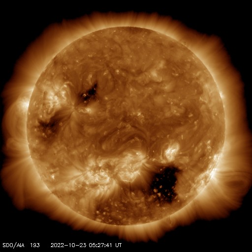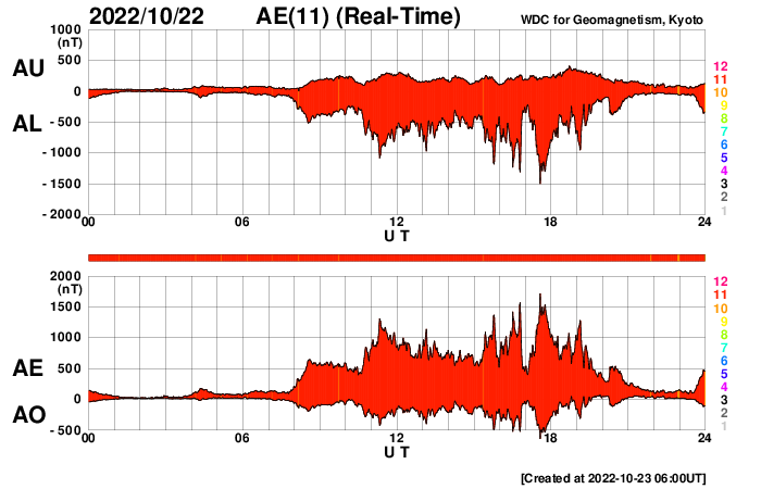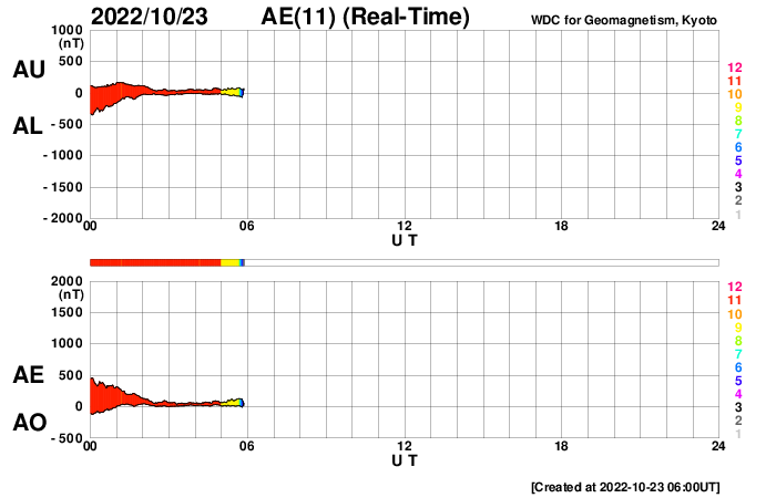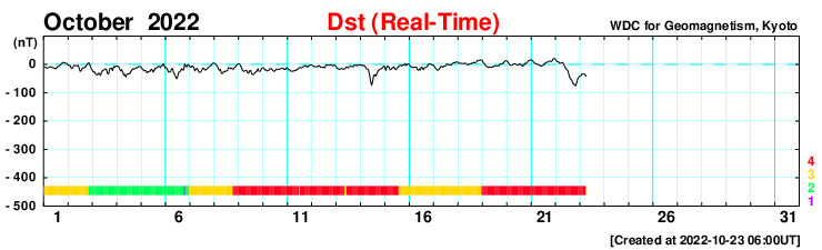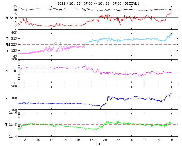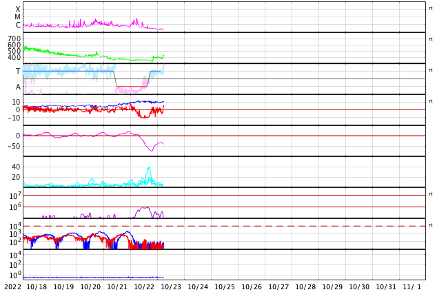 2022/10/23 15:14 更新 太陽風磁場が南向きに強まり、磁気圏の活動も強まりました。 担当 篠原 太陽風は、昨日のニュースの後に磁場の南北成分が南向きに強まり、 今日未明にかけて、-10nT程度の変化が続きました。 速度は350km/秒と低速でしたが、 磁気圏の活動は強まって、 AE指数は、1000〜1500nTの大きい変化が9時間ほど続き、 Dst指数の速報値は-75nTまで下がり、 中規模の磁気嵐になっています。 その後、磁場強度は10nTに強まったままですが、 南北成分は0nT付近に下がり、 磁気圏の活動も小さくなっています。 太陽風の速度は、 南向きの磁場が小さくなった頃に400km/秒へ高まり、 グラフの最後で430km/秒へ上昇しています。 この後、コロナホールの影響で速度が更に高まるかもしれません。 注目してください。 太陽は、昨日の午後に北西の端(右上)の向こう側で、 C6.4、C2.1の小規模フレアが発生しています。 こちらからは見えない領域で発生しているので、 本当の規模はこれよりも大きかった可能性があります。 一方、太陽のこちら側では目立つフレアの発生はなく、 X線グラフの強度も下がっています。