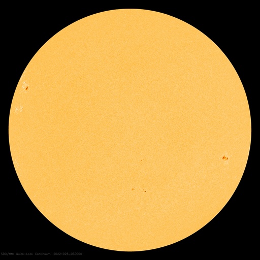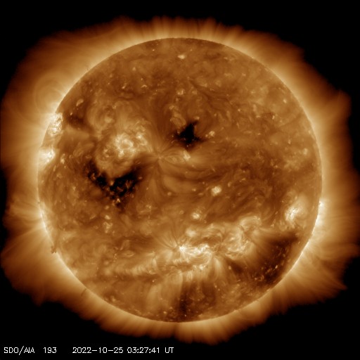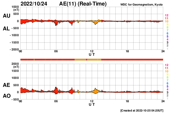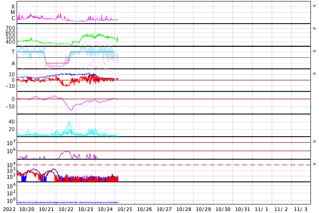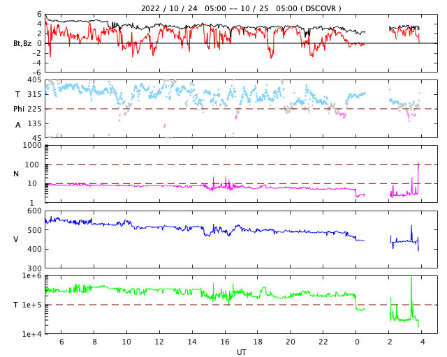 2022/10/25 13:37 更新 太陽風の速度は下がっています。磁気圏は穏やかです。 担当 篠原 550km/秒に高まっていた太陽風の速度は、 昨日の昼以降は次第に低下して、 今朝早くに500km/秒台を割り、 現在は440km/秒と平均的な状態に戻っています。 27日周期の図を見ると、 2日程度で速度の高まりは終わりそうです。 太陽風の磁場強度も5nTから3nTへ下がり、 やや弱くなっています。 南北成分は北寄りで、磁気圏は穏やかです。 AE指数は、後半からは変化が見られなくなっています。 SDO衛星AIA193では、 北半球のコロナホールが太陽の中心線に達していて、 次のコロナホールが東側(左側)に見えています。 3日後くらいからは、 これらの領域の影響が始まる可能性があります。 太陽は、南西(右下)の3126黒点群で、 C4.2、C2.5の小規模フレアが発生しています。 北東の端(左上)の黒点には、 3131群と番号が付けられています。 今のところ、Bクラスの小さいフレアが発生した程度です。 また、3131群の左側と下側にも新しい黒点が現れています。
