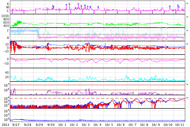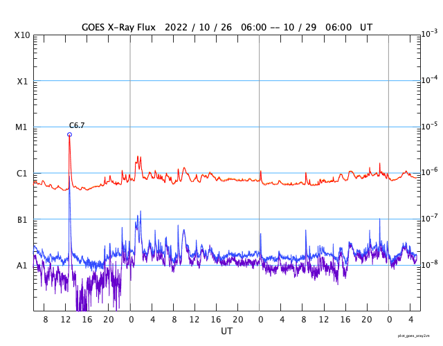 GOES衛星の太陽X線強度。赤・橙 = 0.1〜0.8 nm、青・紫 = 0.05〜0.4 nm (c) データ:NOAA/SWPC、作図:宇宙天気ニュース ![]() | ||||||||||||||||||||||||||||||||||||||||||||||||||||||||||||||||||||||||||||||||||||||||||||||||||||||||||||||||||||||||||||||||||||||||||||||||||||||||||||||||||||||||||||||||||||||||||||||||||||||||||||||||||||||||||||||||||||