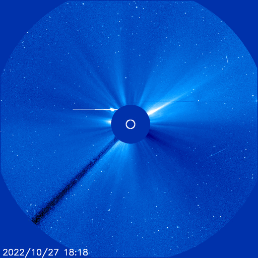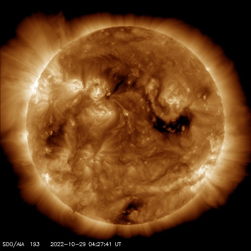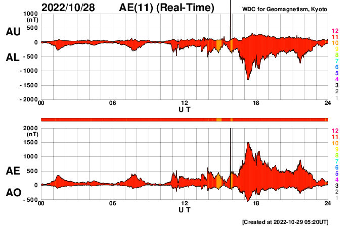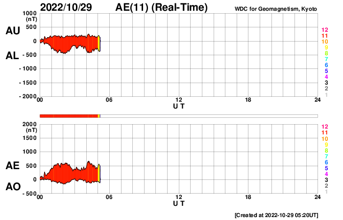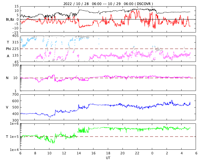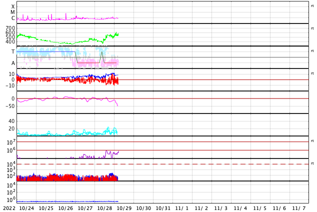 2022/10/29 14:22 更新 高速太陽風が到来し、磁気圏の活動が強まっています。 担当 篠原 SOHO衛星LASCO C3の右端から、 太陽の向こう側を進んでいる水星が見えてきました。 地球では11月9日頃に太陽と重なってしまうそうですが、 SOHO衛星からはどう見えるでしょうか。 太陽の左上で明るく光っているのは金星です。 太陽風は、昨夜遅くに速度が上昇して、 500〜550km/秒と高速の状態に変わっています。 コロナホールの影響が始まった様です。 磁場強度は、速度が高まる頃に5nTから10nTへ強まり、 今朝以降は8nTとやや強い状態です。 磁場の南北成分は南寄りになっていて、 -5nTに達する変化が頻繁に発生しています。 このため磁気圏の活動は活発になり、 AE指数は500nTに達する変化が半日ほど続いていて、 最大では1500nTに達しています。 極域ではきれいなオーロラが見えていたのではないでしょうか。 SDO衛星AIA193では、 北半球のコロナホールは、 左端がちょうど中心線に達しているところです。 この辺りまで影響が及ぶとすると、 4〜5日後くらいまで速度の高まりは続くかもしれません。 太陽は、北東(左上)の3135黒点群で C1台の小さい小規模フレアが3回発生しています。 SDO衛星AIA131を見ると、 小さい活動が連続しているので、 規模が大きくなる様であれば注意が必要になるでしょう。