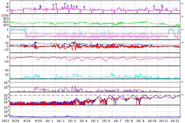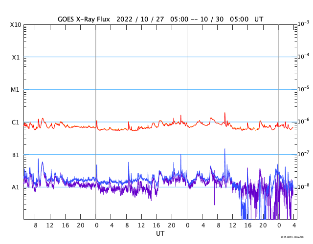 GOES衛星の太陽X線強度。赤・橙 = 0.1〜0.8 nm、青・紫 = 0.05〜0.4 nm (c) データ:NOAA/SWPC、作図:宇宙天気ニュース ![]() | ||||||||||||||||||||||||||||||||||||||||||||||||||||||||||||||||||||||||||||||||||||||||||||||||||||||||||||||||||||||||||||||||||||||||||||||||||||||||||||||||||||||||||||||||||||||||||||||||||||||||||||||||||||||||||||||||||||