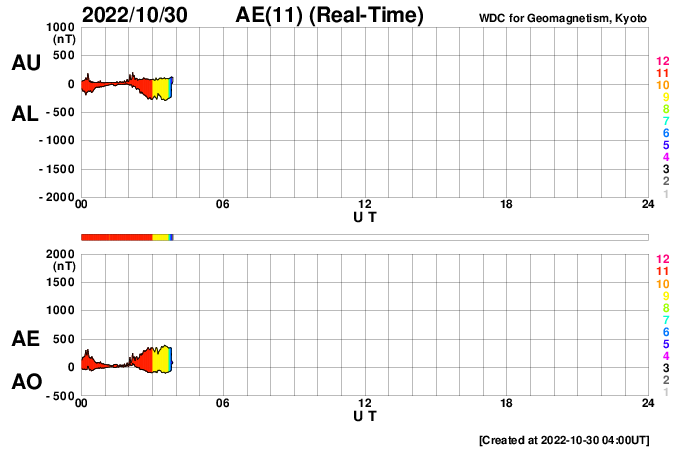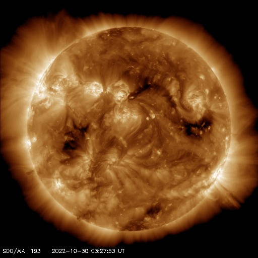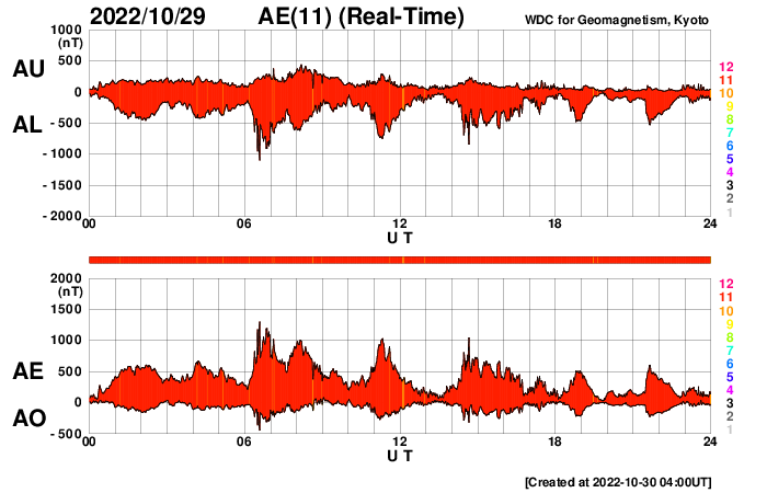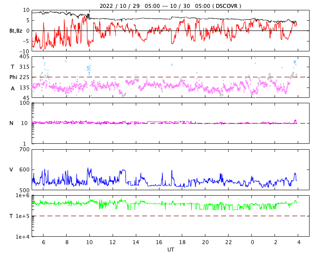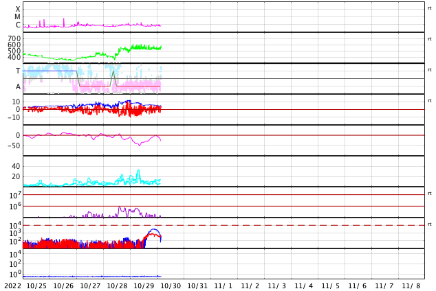 2022/10/30 13:08 更新 太陽風は高速の状態が続いています。磁気圏も活動的です。 担当 篠原 宇宙天気ではない話題が続いてしまいますが、 SOHO衛星LASCO C3、C2で、 右下側から小型の彗星が太陽に向かう様子が見えていました。 昨日の動画にも小さく写っていたのですが、見落としていて、 今日のC2画像で気付きました。 LASCO C2、C3は、CMEを調べるために見ているのですが、 様々な天文現象も見せてくれます。 太陽風は、速度のデータが少し不安定になっていますが、 530km/秒前後の高速の状態が続いています。 磁場強度は、小幅ですが8nTから5nTへ下がり、 平均的な強さになっています。 磁場の南北成分は、南北に変化しています。 磁気圏活動は強まった状態が続いていて、 AE指数は、500〜1200nTと 中規模の変化が頻繁に発生しています。 変化の大きさは次第に小さくなっていて、 この後は小規模の変化が中心になるかもしれません。 SDO衛星AIA193では、 北半球のコロナホールは西側に進んでいます。 高速の太陽風はこれから後半に入りそうです。 太陽は、C1台の小さい小規模フレアが4回発生した程度です。 穏やかな状態です。