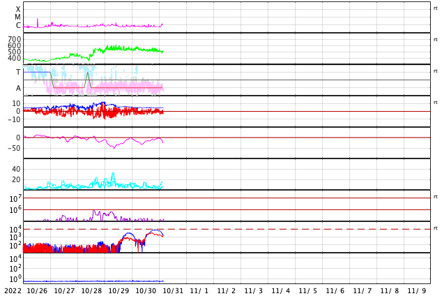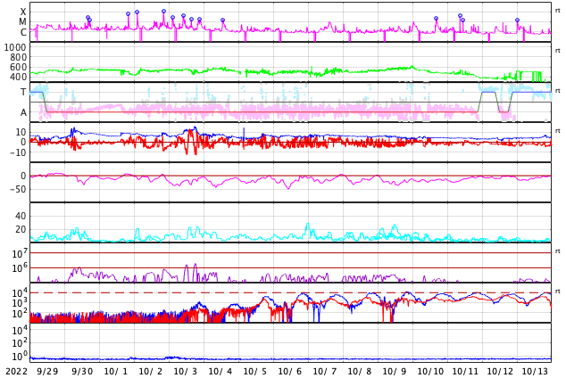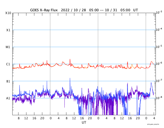 GOES衛星の太陽X線強度。赤・橙 = 0.1〜0.8 nm、青・紫 = 0.05〜0.4 nm (c) データ:NOAA/SWPC、作図:宇宙天気ニュース ![]() | ||||||||||||||||||||||||||||||||||||||||||||||||||||||||||||||||||||||||||||||||||||||||||||||||||||||||||||||||||||||||||||||||||||||||||||||||||||||||||||||||||||||||||||||||||||||||||||||||||||||||||||||||||||||||||