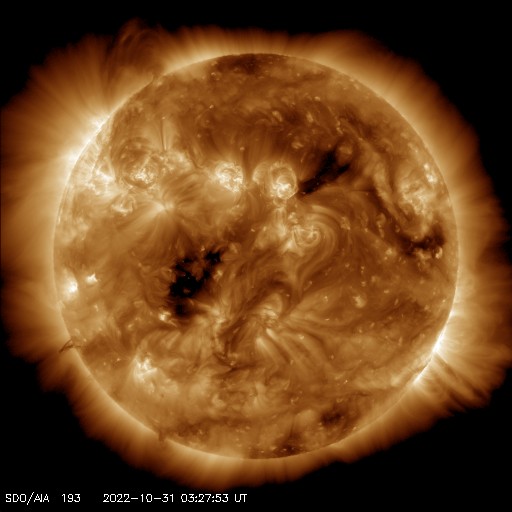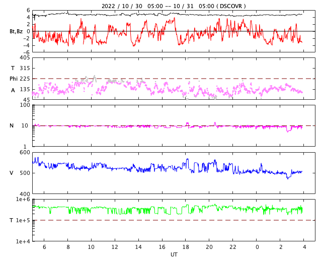 2022/10/31 13:07 更新 太陽風は高速の状態が続いています。太陽は穏やかです。 担当 篠原 太陽風の速度は、550km/秒から500km/秒へ ゆっくりと低下しています。 高速の状態は続いていますが、 勢いは少し下がっています。 磁場強度は、5nTと平均的な状態で安定しています。 磁場の南北成分は、南北に変化が続いています。 このため磁気圏の活動はある程度強まった状態が続き、 AE指数では、300〜500nTの小規模の変化が連続して、 1000nTに達する大きい変化も発生しています。 SDO衛星AIA193では、 北半球のコロナホールは西側(右)に進み、 中心部の東側(左)に次の小さいコロナホールが見えています。 4日後くらいから、この新しい領域の影響が始まりそうです。 27日周期の図を見ると、 前周期の太陽風は、10月11日にかけて速度の高まりが続いています。 今回もこの様に速度の高まりが続くのか、 一旦下がって、次の変化に切り替わるのか、 今後の推移に注目してください。 太陽は、C1の小さい小規模フレアが発生した程度で、 穏やかに推移しています。 ![]() SDO衛星のAIA193カメラによる太陽コロナの様子 (c) SDO (NASA) ![]() SDO衛星による太陽の可視光写真。マウスの矢印を写真に重ねると、黒点番号付きの写真に切り替わります。 (c) SDO (NASA) ![]() DSCOVRが観測した太陽風の磁場(黒線は全体の強度、赤線は南北成分) 磁場の向き、プラズマの密度、速度、温度 (c) データ:NOAA/SWPC、作図:宇宙天気ニュース ![]() AE指数(速報値) 下段のAEグラフの値が高くなると、オーロラ活動が活発化しています。 (c) 京都大学WDC ![]() ![]() 27日の太陽周期に合わせた図 太陽が同じ面を地球に向けていた27日前の変化から、今後を予想することができます。 (c) 作図:宇宙天気ニュース