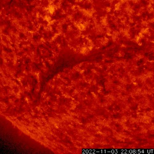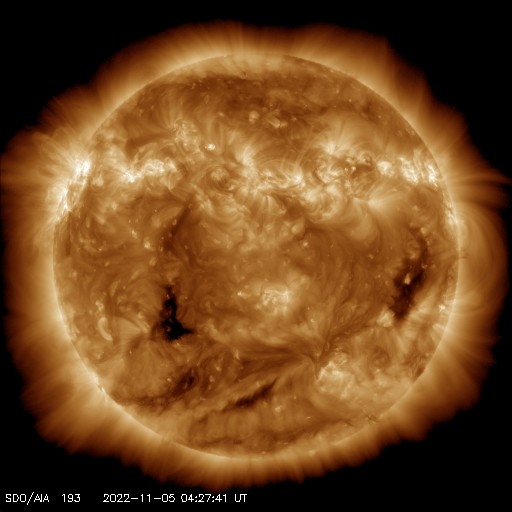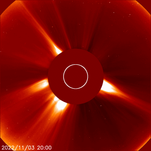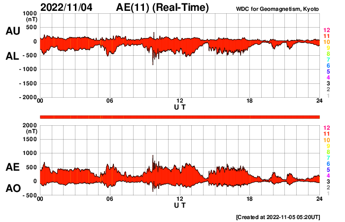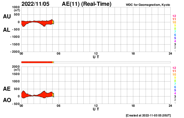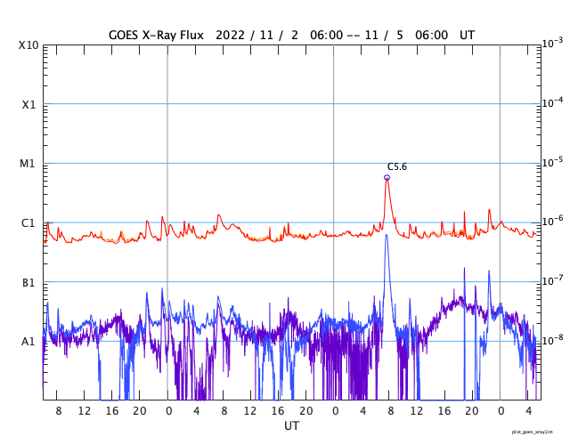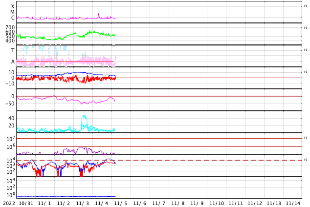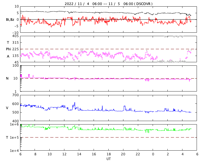 2022/11/ 5 14:23 更新 CMEが発生しています。高速太陽風が続いていますが、速度は下がって来ました。 担当 篠原 昨日のニュースのプロミネンス噴出の動画の最後に、 太陽の南東側(左下)で見え始めていたフィラメント噴出の様子を、 SDO衛星AIA304の動画で紹介します。 昨日、4日10時(世界時4日1時)頃から、 ダークフィラメントの黒い筋が浮き上がっています。 途中から2本の筋が重なるような見え方になっています。 太陽の北東(左上)のプロミネンス噴出と、 南東のフィラメント噴出による2方向のCME(コロナ質量放出)を、 SOHO衛星LASCO C2、C3の動画で紹介します。 北東のCMEは、地球に対して横向きなので影響はないでしょう。 一方、南東のCMEは、東西に大きく広がって見えています。 太陽風の乱れは地球にもやって来るかもしれません。 3日程度かかると考えると、明後日、7日頃でしょうか。 太陽風の磁場の強まりなどに注目して下さい。 太陽の可視光写真では、東端(左端)に3141黒点群が現れています。 昨夕、4日16時(世界時4日7時)にC5.6の小規模フレアを起こし、 今朝までに、C1.5、C1.6のフレアも起こしています。 この後の活動に注目して下さい。 太陽風は、昨日の午後から速度が低下に向かい、 580km/秒から500km/秒へ下がっています。 磁場強度もグラフの最後で3nTに下がり、やや弱くなっています。 高速太陽風は終わりに近付いている様です。 磁場の南北成分は、南寄りの変化が続き、 磁気圏の活動も続いています。 AE指数は、グラフの中盤までは500nT前後の変化が見られ、 後半は少し下がって300nT程度になっています。 太陽風の速度が下がってきたので、 磁気圏の活動も次第に小さくなりそうです。 ![]() 太陽の南東側で発生したフィラメント噴出。SDO衛星AIA304。 (c) SDO (NASA)、(動画加工 : 宇宙天気ニュース) ![]() 太陽の北東と南東に飛び出すCME。SOHO衛星LASCO C2、C3。 (c) SOHO (ESA & NASA)、 (動画加工 : 宇宙天気ニュース) ![]() SDO衛星のAIA193カメラによる太陽コロナの様子 (c) SDO (NASA) ![]() SDO衛星による太陽の可視光写真。マウスの矢印を写真に重ねると、黒点番号付きの写真に切り替わります。 (c) SDO (NASA) ![]() GOES衛星の太陽X線強度。赤・橙 = 0.1〜0.8 nm、青・紫 = 0.05〜0.4 nm (c) データ:NOAA/SWPC、作図:宇宙天気ニュース ![]() DSCOVRが観測した太陽風の磁場(黒線は全体の強度、赤線は南北成分) 磁場の向き、プラズマの密度、速度、温度 (c) データ:NOAA/SWPC、作図:宇宙天気ニュース ![]() AE指数(速報値) 下段のAEグラフの値が高くなると、オーロラ活動が活発化しています。 (c) 京都大学WDC ![]() ![]() 27日の太陽周期に合わせた図 太陽が同じ面を地球に向けていた27日前の変化から、今後を予想することができます。 (c) 作図:宇宙天気ニュース