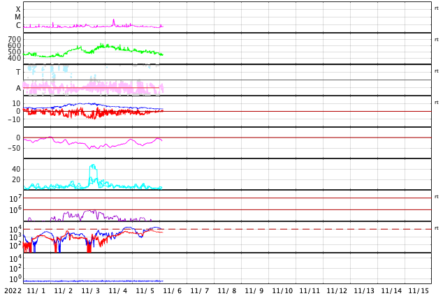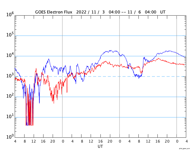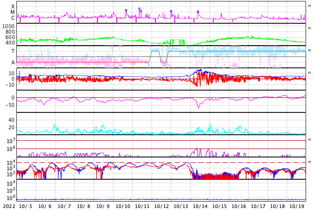 GOES衛星の太陽X線強度。赤・橙 = 0.1〜0.8 nm、青・紫 = 0.05〜0.4 nm (c) データ:NOAA/SWPC、作図:宇宙天気ニュース ![]() GOES衛星による、静止衛星軌道における高エネルギー電子 ( 2 MeV 以上 ) の変化 (c) データ:NOAA/SWPC、作図:宇宙天気ニュース ![]() | ||||||||||||||||||||||||||||||||||||||||||||||||||||||||||||||||||||||||||||||||||||||||||||||||||||||||||||||||||||||||||||||||||||||||||||||||||||||||||||||||||||||||||||||||||||||||||||||||||||||||||||||||||||||||||||||||||||||