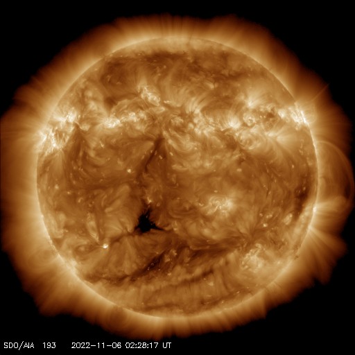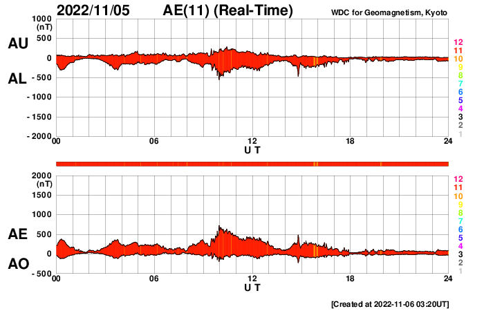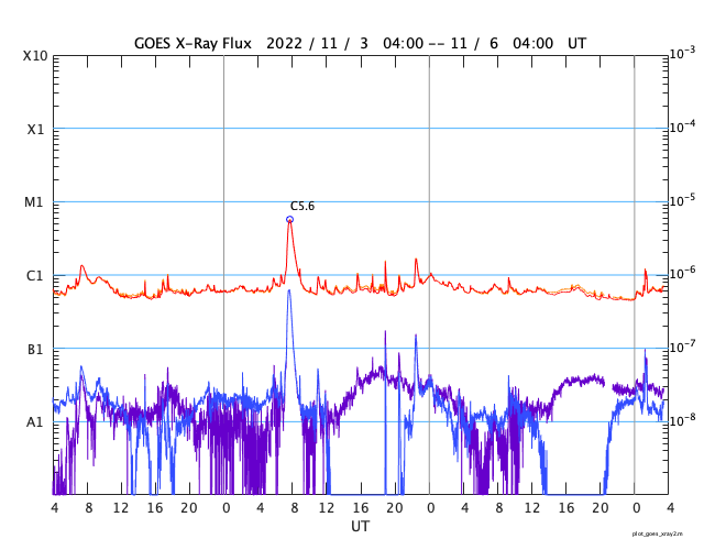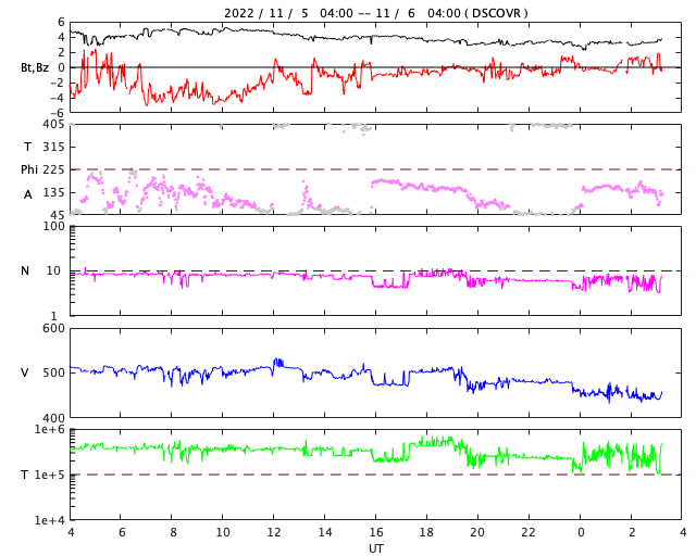 2022/11/ 6 12:31 更新 高速太陽風は終わりを迎えた様です。磁気圏は穏やかになっています。 担当 篠原 太陽風の速度は、今日に入る頃に500km/秒台を割り、 現在は450km/秒と平均的な速度に戻りつつあります。 磁場強度は、3〜4nTとやや弱い状態です。 高速太陽風の領域は通り過ぎた様です。 磁場の南北成分は、グラフの前半は南寄りでしたが、 後半は0nT付近で変化が小さくなっています。 このため、磁気圏の活動は穏やかになっていて、 AE指数は、途中までは300〜500nTの 小規模の変化が発生していますが、 後半は変化が見られなくなっています。 SDO衛星AIA193を見ると、 中心部の南東側(左下)に小さいコロナホールがある程度です。 太陽風は、しばらく穏やかに推移するのではないでしょうか。 太陽は、X線グラフの最後に C1.2の小さい小規模フレアが発生しただけで、 穏やかに推移しています。 放射線帯の高エネルギー電子は、 青線のGOES-17が1万に達しています。 ![]() SDO衛星のAIA193カメラによる太陽コロナの様子 (c) SDO (NASA) ![]() SDO衛星による太陽の可視光写真。マウスの矢印を写真に重ねると、黒点番号付きの写真に切り替わります。 (c) SDO (NASA) ![]() DSCOVRが観測した太陽風の磁場(黒線は全体の強度、赤線は南北成分) 磁場の向き、プラズマの密度、速度、温度 (c) データ:NOAA/SWPC、作図:宇宙天気ニュース ![]() AE指数(速報値) 下段のAEグラフの値が高くなると、オーロラ活動が活発化しています。 (c) 京都大学WDC ![]() ![]() 27日の太陽周期に合わせた図 太陽が同じ面を地球に向けていた27日前の変化から、今後を予想することができます。 (c) 作図:宇宙天気ニュース