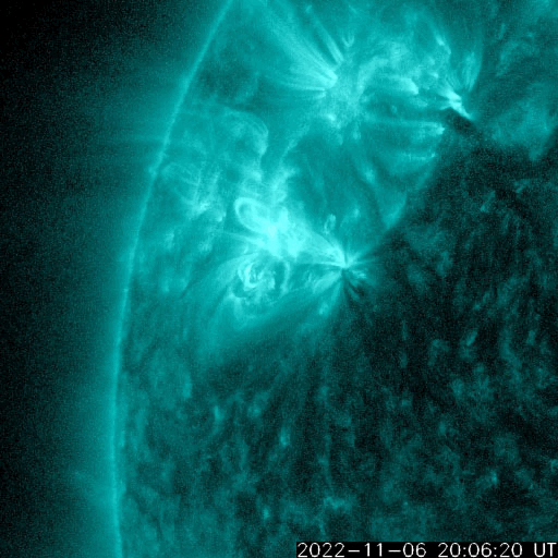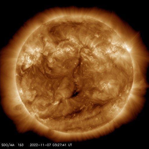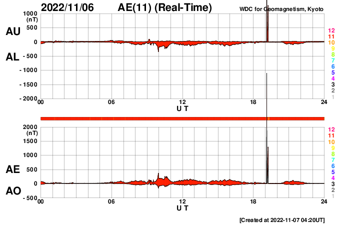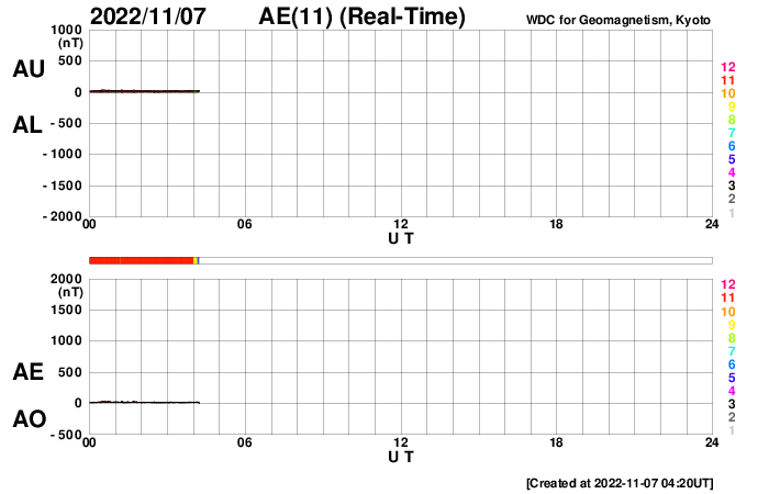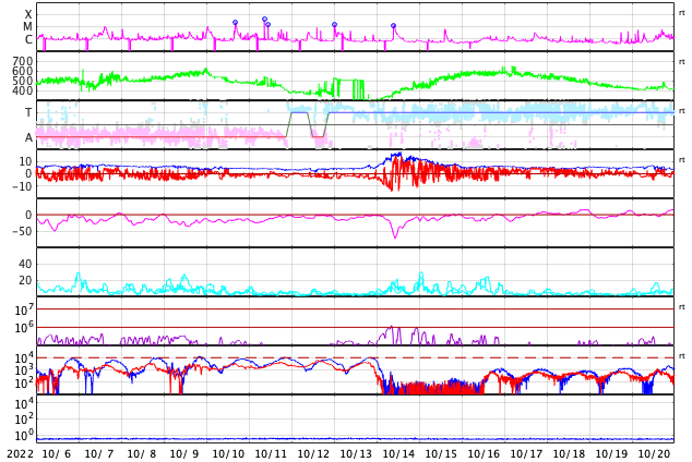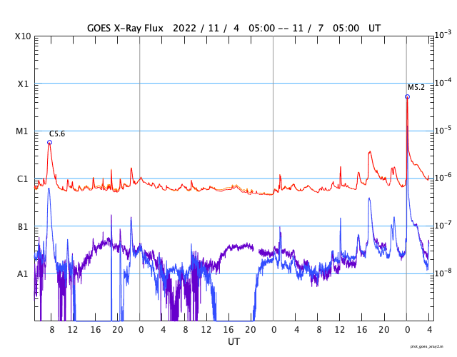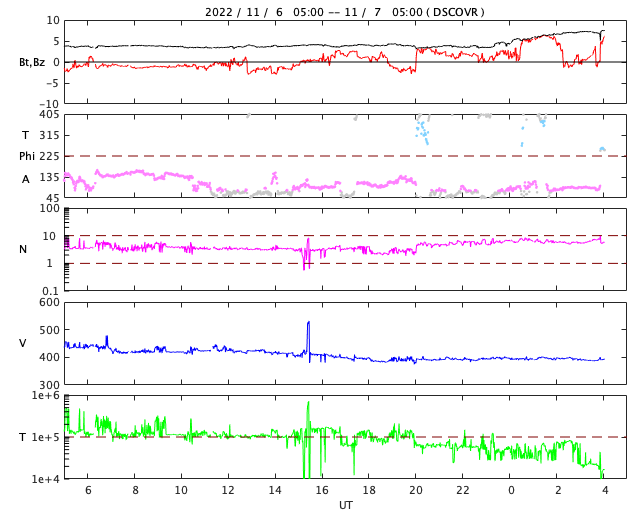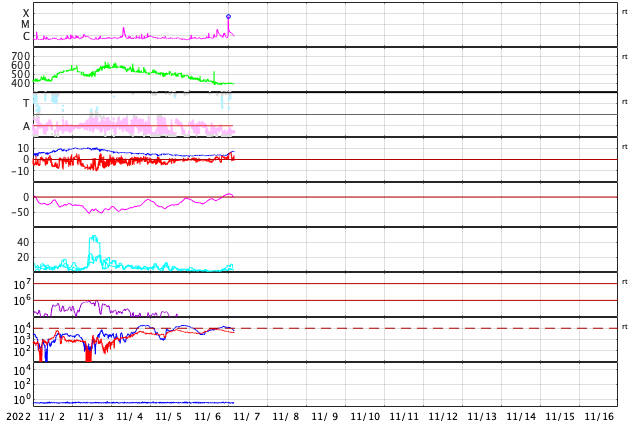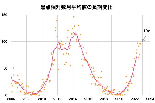 2022/11/ 7 13:20 更新 M5.2の中規模フレアが発生しました。10月の黒点相対数は 95.4 でした。 担当 篠原 WDC-SILSOより、10月の黒点相対数は 95.4 と発表されました。 9月の96.3とほぼ同じ値で、 グラフでは、くっつく様に2つの点が並んでいます。 2枚目の動画で様子を見ることができますが、 10月は、前半は黒点相対数が100を超える日が続いたのですが、 後半は100以下の日が続き、月平均値も100以下になりました。 前周期の2011年では、 9〜12月にかけて月平均値は100を超えたのですが、 今回はこの様な高まりはまだ発生していません。 一方、赤線の13か月平均値と比べると、 同じくらいの高さに値が達しているので、 周期の推移としては、第24期と同程度になっていると言えそうです。 その太陽ですが、今朝、7日9時(世界時7日0時)に、 東側(左側)の3141黒点群でM5.2の中規模フレアが発生しました。 SDO衛星AIA131の動画を掲載します。 3141黒点群は、昨夜遅くから C1、C3の小規模フレアを繰り返すようになり、 一気に規模が大きくなって、中規模フレアの発生になりました。 M5に達するフレアの発生は、10月2日のX1.0以来で、 1か月ぶりです。 この後の3141群の活動に注目してください。 太陽風は、450km/秒から400km/秒へ速度が少し下がり、 平均的な速さになっています。 磁場強度は、4nTで安定していたのですが、 グラフの最後で7nTに少し強まっています。 この後どの様に変化するでしょうか。 しばらく注目して下さい。 現在の磁気圏は穏やかで、 AE指数は、途中まで小さい変化が続きましたが、 後半は変化がなくなっています。 SDO衛星AIA193の太陽コロナ写真では、 目立つ程のコロナホールはなく、 太陽風は穏やかな状態が続きそうです。 放射線帯の高エネルギー電子は、 今日も1万に達しています。 この後はゆっくり減少するでしょう。