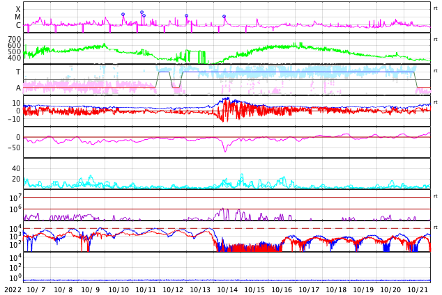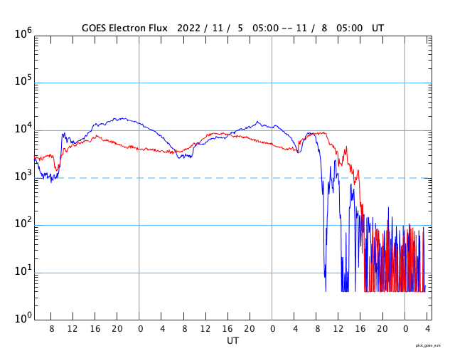GOES衛星の太陽X線強度。赤・橙 = 0.1〜0.8 nm、青・紫 = 0.05〜0.4 nm (c) データ:NOAA/SWPC、作図:宇宙天気ニュース ![]() GOES衛星による、静止衛星軌道における高エネルギー電子 ( 2 MeV 以上 ) の変化 (c) データ:NOAA/SWPC、作図:宇宙天気ニュース ![]() | ||||||||||||||||||||||||||||||||||||||||||||||||||||||||||||||||||||||||||||||||||||||||||||||||||||||||||||||||||||||||||||||||||||||||||||||||||||||||||||||||||||||||||||||||||||||||||||||||||||||||||||||||||||||||||||||||||||||||||