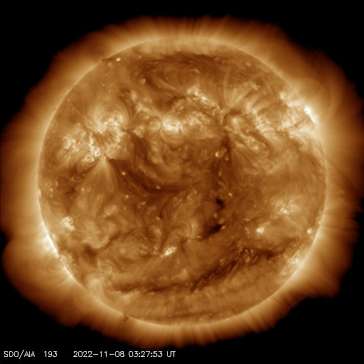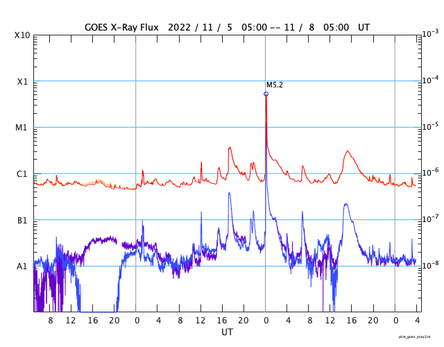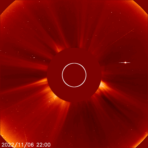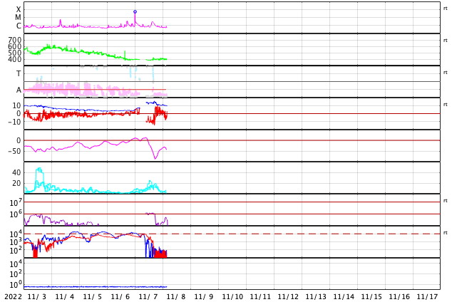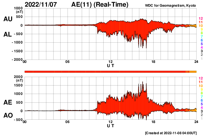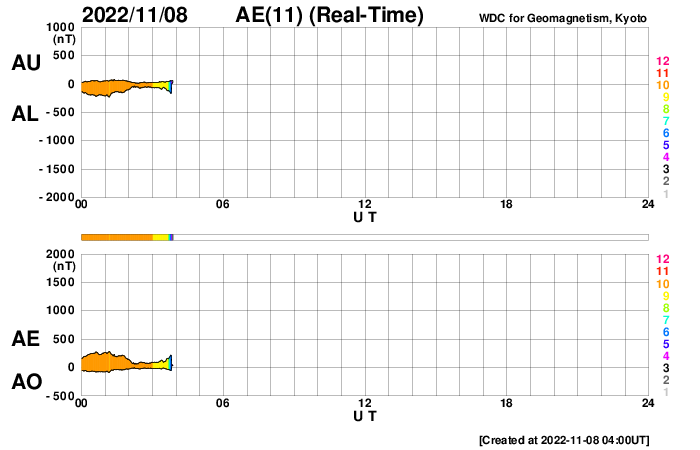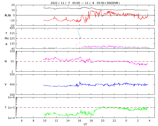 2022/11/ 8 13:03 更新 太陽風磁場の強まりが到来し、磁場が南向きに変化して磁気圏の活動が強まりました。 担当 篠原 7nTに少し強まっていた太陽風の磁場強度は、 昨日の夕方には14nTへ強まりました。 速度は380〜400km/秒と平均的な状態です。 5日のニュースでお知らせしたCME(コロナ質量放出)の影響が やって来たのかもしれません。 DSCOVR衛星のデータが一部欠けているので、 ACE衛星のグラフも掲載します。 磁場の南北成分は、 磁場が強まってしばらくして -10nTと南向きに強まり、 この状態が8時間ほど続いています。 このため磁気圏の活動が活発になり、 AE指数は1000〜1500nTの大規模な変化が続きました。 今日未明には磁場は北寄りに切り替わり、 磁気圏は穏やかになっています。 現在も磁場強度は10nTと強まった状態です。 南北成分はグラフの最後で南向きに変わっていて、 この状態が続くと、磁気圏の活動もある程度強まりそうです。 SDO衛星AIA193では、目立つ規模のコロナホールはなく、 太陽風は穏やかに推移しそうです。 太陽は、昨日のM5.2以降は、 同じ3141黒点群でC1.4、C3.1の小規模フレアが発生した程度で、 落ち着いた状態です。 SOHO衛星LASCO C2によると、 昨日のM5.フレアに伴うCMEは小規模で、 左に向かう噴出が淡く見える程度でした。 この動画では、 太陽の向こう側を進む水星が太陽の右側に見えています。 また、右下から小型の彗星が太陽に向かっています。 放射線帯の高エネルギー電子は、 磁気圏活動の強まりの影響で、大きく減少しています。