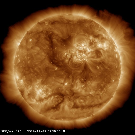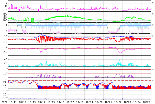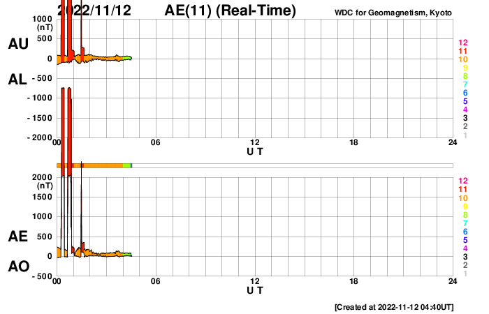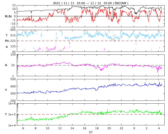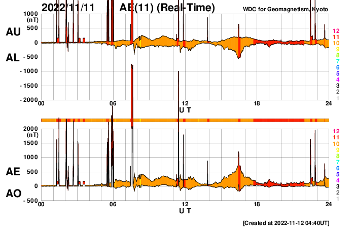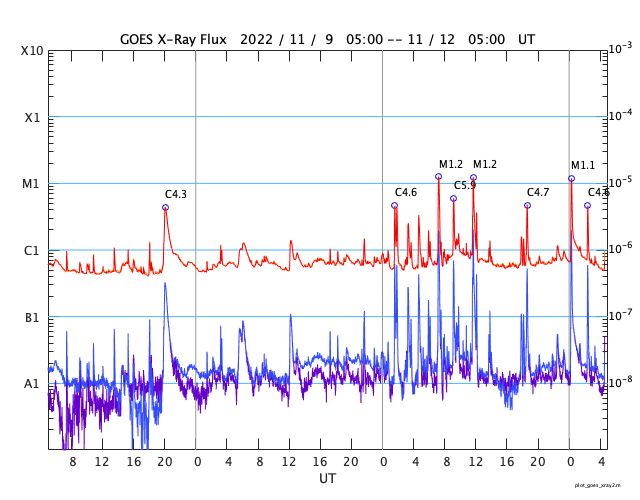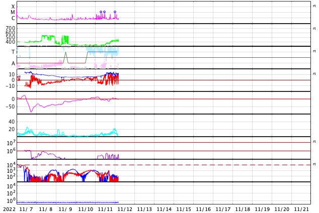 2022/11/12 13:49 更新 中規模フレアが3回発生しています。太陽風は平均的な速度に上がっています。 担当 篠原 太陽の3141黒点群の活動が強まり、 昨夕、11日16時(世界時11日7時)にM1.2、 夜の11日20時半(世界時11日11時半)にM1.2、 今朝、12日9時(世界時12日0時)にM1.1と、 中規模フレアが3回、 そして、Cクラスの小規模フレアが10回ほど発生しています。 X線グラフが一気ににぎやかになっています。 この後も活動に注目してください。 太陽風は、速度が300km/秒から420km/秒に上がり、 平均的な状態に戻っています。 磁場強度は12nT前後に強まっています。 SDO衛星AIA193では、 コロナホールは特に見えていなかったのですが、 この後、高速風へ変化するのでしょうか。 引き続き太陽風の変化に注目してください。 太陽風磁場の南北成分は、 南北への変化が繰り返されています。 全体としては北向きの方が長くなっている様で、 そのためか、磁気圏の活動は少し強まっている程度です。 AE指数は、小規模の変化が続いています。