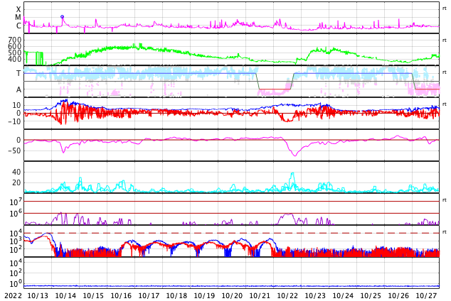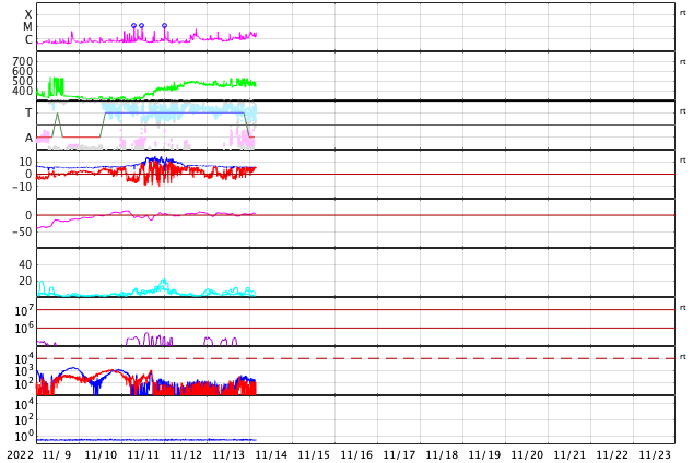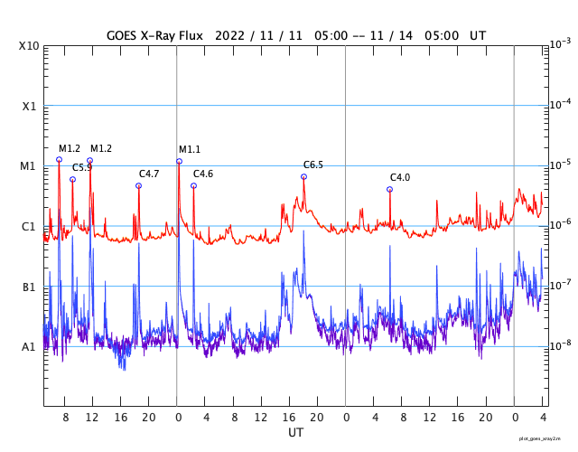 GOES衛星の太陽X線強度。赤・橙 = 0.1〜0.8 nm、青・紫 = 0.05〜0.4 nm (c) データ:NOAA/SWPC、作図:宇宙天気ニュース ![]() | ||||||||||||||||||||||||||||||||||||||||||||||||||||||||||||||||||||||||||||||||||||||||||||||||||||||||||||||||||||||||||||||||||||||||||||||||||||||||||||||||||||||||||||||||||||||||||||||||||||||||||||||||||||||||||||||||||||||||||||||||||||||||||||||||||||||