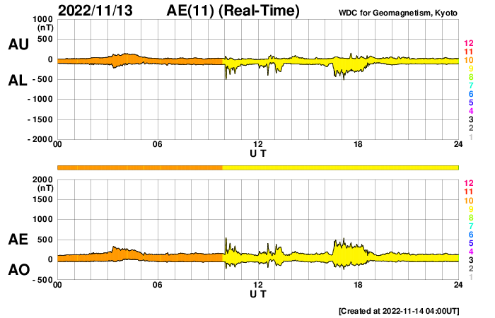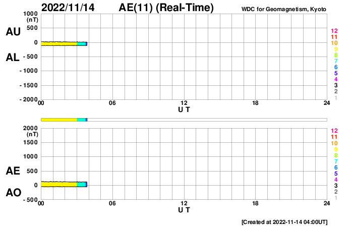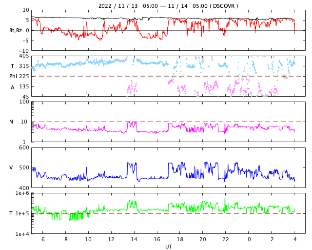 2022/11/14 13:18 更新 太陽風はやや高速です。太陽でC1〜4のフレアが続いています。 担当 篠原 太陽風は、速度のグラフが後半から不安定になっています。 450〜480km/秒とやや高速くらいで推移している様に見えます。 磁場強度は、6nTと平均的な状態で安定しています。 27日周期の図を見ると、 前周期の太陽風は、500km/秒台の高速風が4日ほど続いていました。 速度は下がっていますが、 今回もある程度の高まりが回帰したということの様です。 磁場の南北成分は、北向きの時間が長く、 南向きは、弱い変化が時々見られています。 磁気圏は基本的に穏やかで、 AE指数は、小規模の変化が3回起きた程度です。 SDO衛星AIA193では、 南東の端(左下)にコロナホールが見えています。 この領域は前周期にもあり、 27日周期の図の10月23〜24日に高速太陽風が到来しています。 今回も5〜6日後くらいから太陽風の速度が高まりそうです。 太陽は、北西(右上)の3141黒点群で、 C1〜4の小規模フレアが発生しています。 また、その右上の3140群と左上の3145群の活動が強まり、 C1〜3の小規模フレアが発生するようになっています。 今のところ規模の小さい変化ですが、 この後も注目してください。