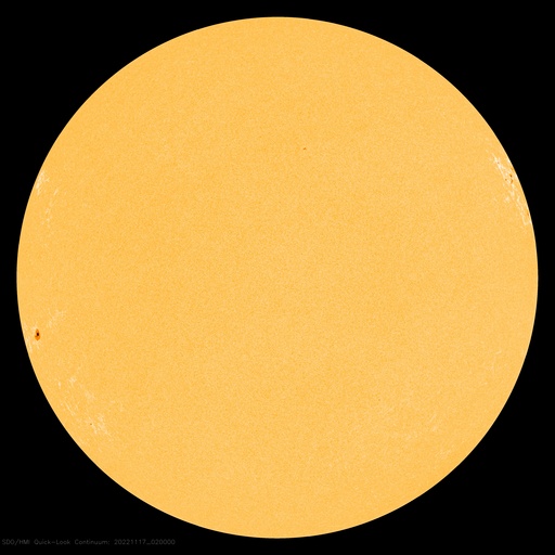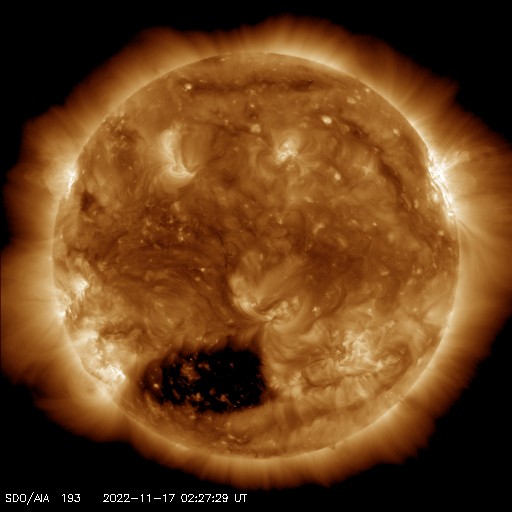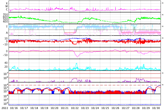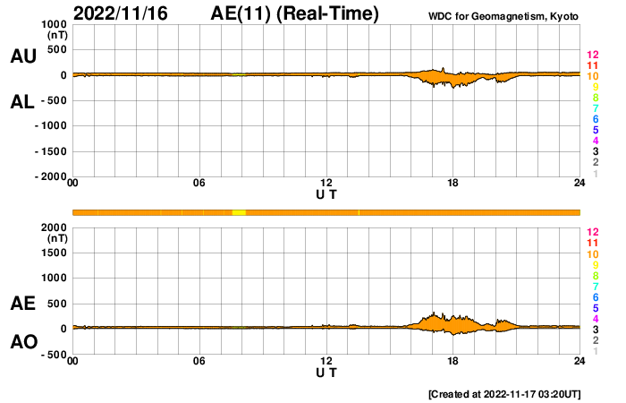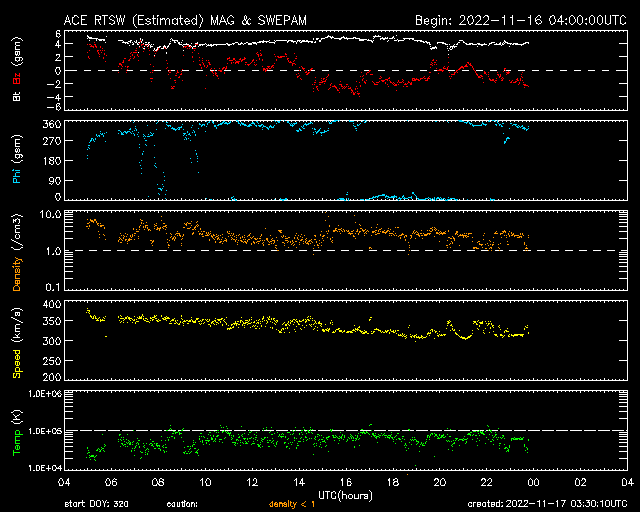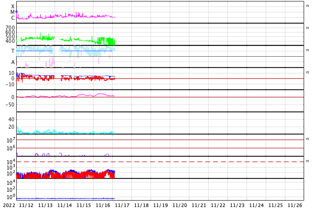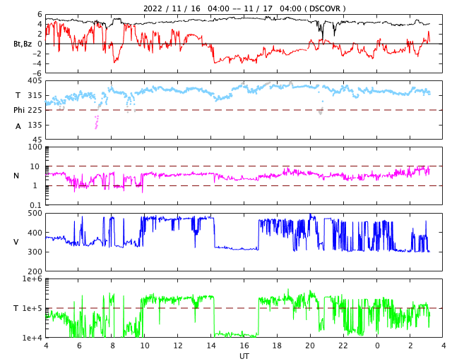 2022/11/17 12:30 更新 太陽風は更に低速になり、磁気圏は穏やかです。 担当 篠原 DSCOVR衛星のデータが乱れているので、ACE衛星を参照すると、 太陽風の速度は370km/秒から300km/秒へ下がり、 さらに低速の風になっています。 磁場強度は、4〜5nTと平均的な状態です。 磁場の南北成分は、 グラフの中盤から弱い南寄りになっています。 しかし、速度が下がっているため影響は小さく、 AE指数は200nTの小規模の変化が1回発生した程度で、 磁気圏は穏やかです。 SDO衛星AIA193の太陽コロナ写真では、 南半球のコロナホールの右端が、太陽の中心線に達しています。 3日後くらいから太陽風速度の上昇が始まりそうです。 コロナホールの東西の広がりは、 前周期よりも大きくなっている様に見えます。 前周期は2日間だった高速太陽風は、より長くなるかもしれません。 太陽は、東端(左)の南北に新しい黒点が現れています。 X線グラフは、C1〜3の小規模の変化が発生した程度で、 太陽は比較的穏やかに推移しています。