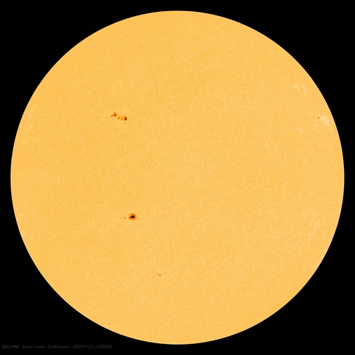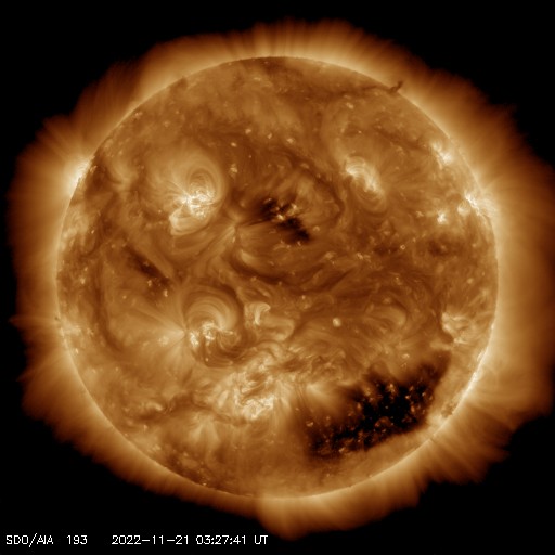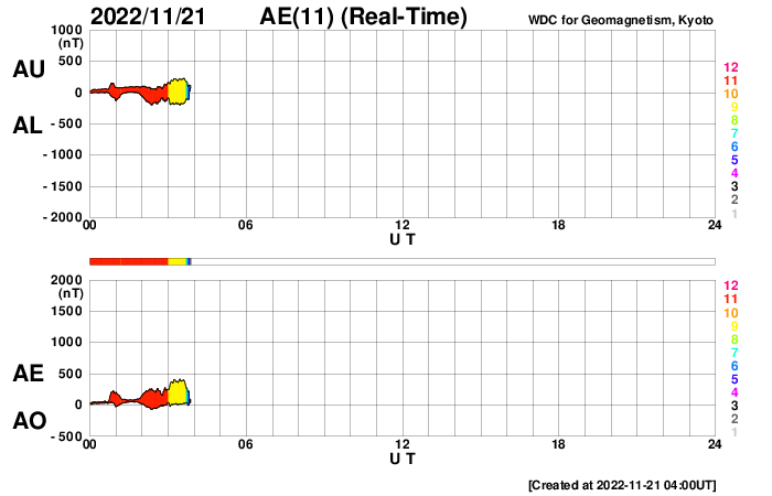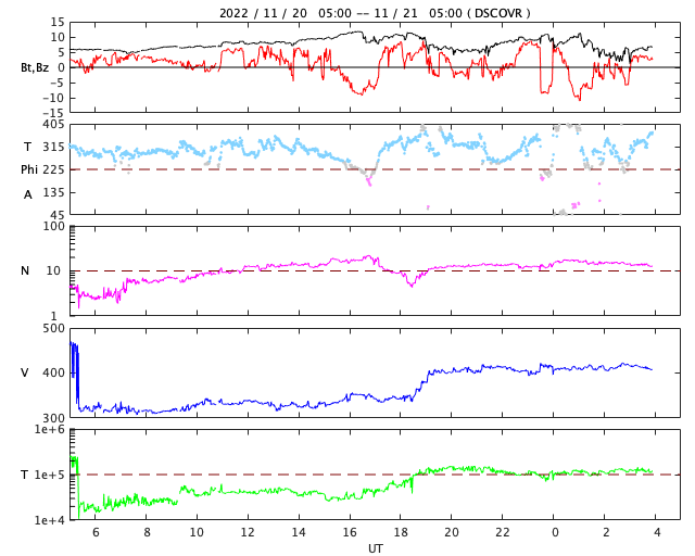 2022/11/21 13:05 更新 太陽風は平均的な速度に上がっています。太陽は穏やかです。 担当 篠原 310km/秒と低速だった太陽風の速度は、 今日の未明に一段上がり、 410km/秒と平均的な速さになっています。 磁場強度は、5nTと10nTの間を上下しています。 SDO衛星AIA193の太陽の 南西(右下)に見えるコロナホールの影響が やって来たのかもしれませんが、 変化としては小さい規模に留まっています。 磁場の南北成分は、少し大きく南北に変化していますが、 南向きの変化は比較的短時間で、 AE指数は300〜500nTの小規模の変化が発生した程度です。 太陽風の強まりはこの規模で終わるのか、 この後もう一段高まるのか、もうしばらく注目してください。 太陽は、北西の端に近付いている3150黒点群で、 C3.3の小規模フレアと、 中心部北東側(左上)の3149群で、 C2.9の小規模フレアが発生しています。 全体としては穏やかな状態です。 ![]() SDO衛星のAIA193カメラによる太陽コロナの様子 (c) SDO (NASA) ![]() SDO衛星による太陽の可視光写真。マウスの矢印を写真に重ねると、黒点番号付きの写真に切り替わります。 (c) SDO (NASA) ![]() DSCOVRが観測した太陽風の磁場(黒線は全体の強度、赤線は南北成分) 磁場の向き、プラズマの密度、速度、温度 (c) データ:NOAA/SWPC、作図:宇宙天気ニュース ![]() AE指数(速報値) 下段のAEグラフの値が高くなると、オーロラ活動が活発化しています。 (c) 京都大学WDC ![]() ![]() 27日の太陽周期に合わせた図 太陽が同じ面を地球に向けていた27日前の変化から、今後を予想することができます。 (c) 作図:宇宙天気ニュース