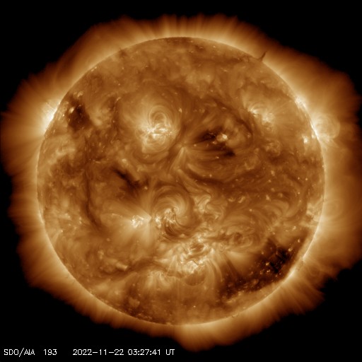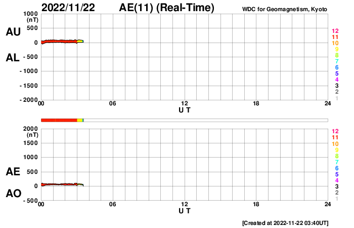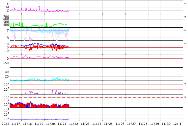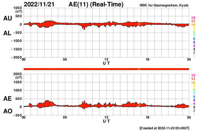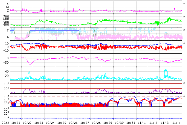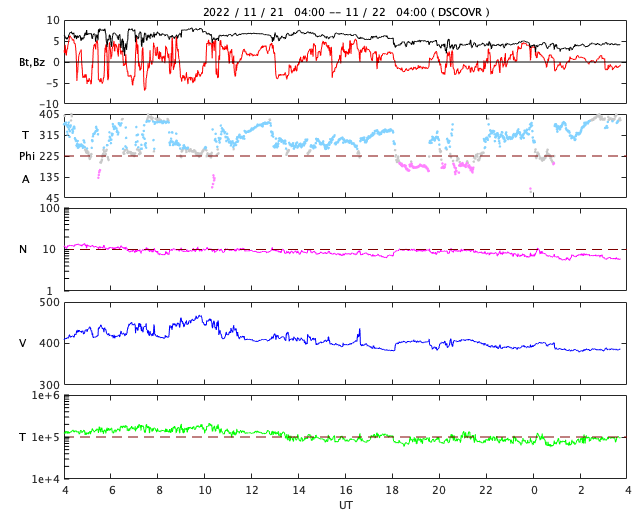 2022/11/22 12:54 更新 太陽風は平均的な状態です。磁気圏も穏やかです。 担当 篠原 太陽風の速度は、400km/秒から450km/秒へ高まりましたが、 その後は下がって、 現在は390km/秒と平均的な状態に戻っています。 磁場強度も、8nTまで強まった後に4nTへ下がっています。 SDO衛星AIA193では、 コロナホールは南西の端(右下)まで進んでいます。 太陽風速度の高まりは来ないままになりそうです。 AE指数は、小規模の変化が度々発生していましたが、 最後は静かになっています。 太陽は、中心部北側(上側)の3149黒点群で C1の小規模フレアが3回発生した程度で、 穏やかな状態です。