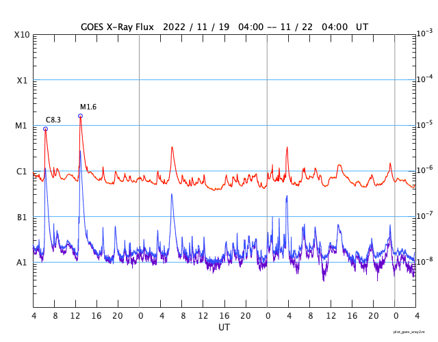 GOES衛星の太陽X線強度。赤・橙 = 0.1〜0.8 nm、青・紫 = 0.05〜0.4 nm (c) データ:NOAA/SWPC、作図:宇宙天気ニュース ![]() | ||||||||||||||||||||||||||||||||||||||||||||||||||||||||||||||||||||||||||||||||||||||||||||||||||||||||||||||||||||||||||||||||||||||||||||||||||||||||||||||||||||||||||||||||||||||||||||||||||||||||||||||||||||||||||||||||