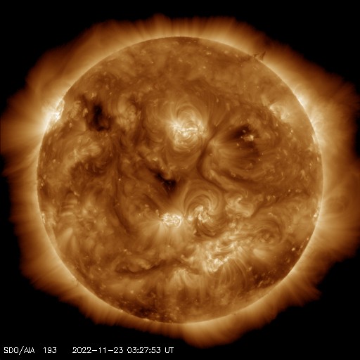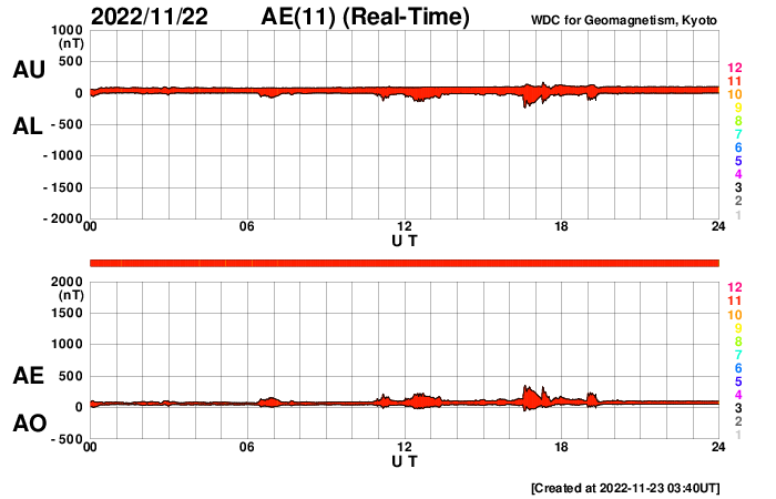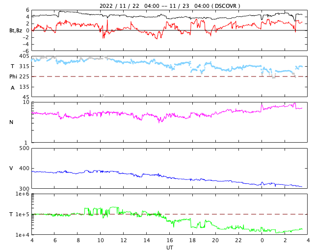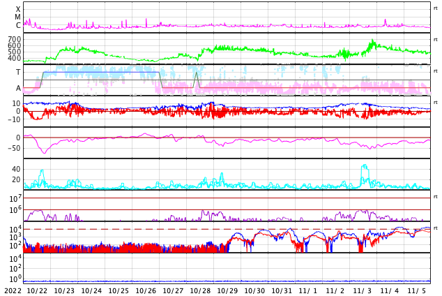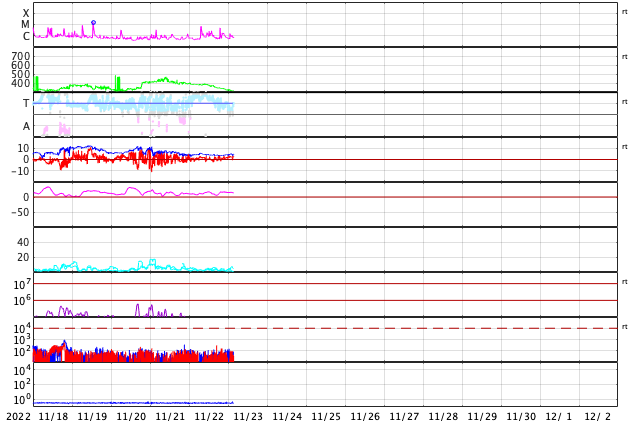 2022/11/23 12:49 更新 太陽風は低速になり、磁気圏も穏やかです。 担当 篠原 400km/秒台を割っていた太陽風の速度は、 昨夜遅くから更に下がり、 310km/秒と低速の状態になっています。 磁場強度は4〜5nTと平均的な値です。 磁気圏は穏やかで、 AE指数は小さい変化が時々発生する程度です。 SDO衛星AIA193の太陽コロナ写真は、 前周期に見られた中心部のコロナホールは小さくなっていて、 目立たなくなっています。 27日周期の図の前周期の 10月28日に始まっている太陽風速度の高まりは、 今回は変化が小さくなっているかもしれません。 明日以降の変化に注目してください。 太陽は、中心部南側の3151黒点群で、 C7.0、C4.8等の小規模フレアが続く様になっています。 活動的な状態はこの後も続くでしょうか。