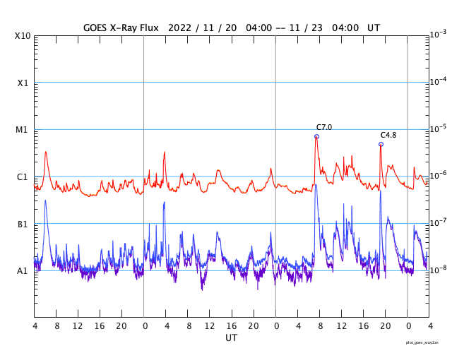 GOES衛星の太陽X線強度。赤・橙 = 0.1〜0.8 nm、青・紫 = 0.05〜0.4 nm (c) データ:NOAA/SWPC、作図:宇宙天気ニュース ![]() | |||||||||||||||||||||||||||||||||||||||||||||||||||||||||||||||||||||||||||||||||||||||||||||||||||||||||||||||||||||||||||||||||||||||||||||||||||||||||||||||||||||||||||||||||||||||||||||||||||||||||||||||||||||||||||||||||||||||