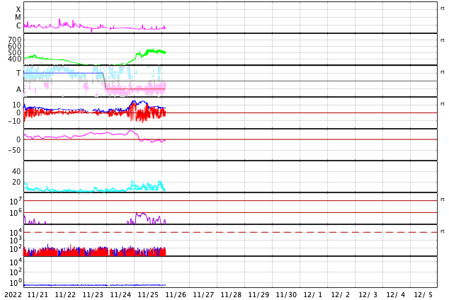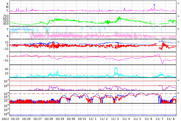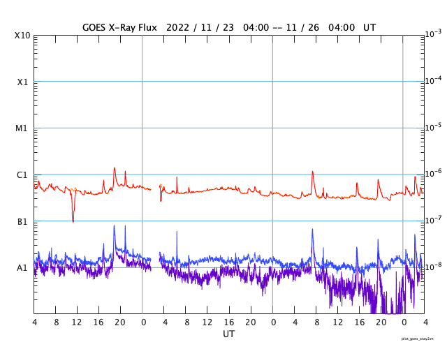 GOES衛星の太陽X線強度。赤・橙 = 0.1〜0.8 nm、青・紫 = 0.05〜0.4 nm (c) データ:NOAA/SWPC、作図:宇宙天気ニュース ![]() | ||||||||||||||||||||||||||||||||||||||||||||||||||||||||||||||||||||||||||||||||||||||||||||||||||||||||||||||||||||||||||||||||||||||||||||||||||||||||||||||||||||||||||||||||||||||||||||||||||||||||||||||||||||||||||