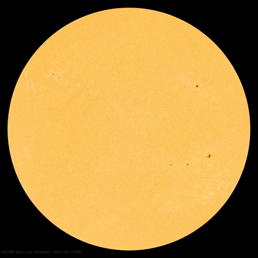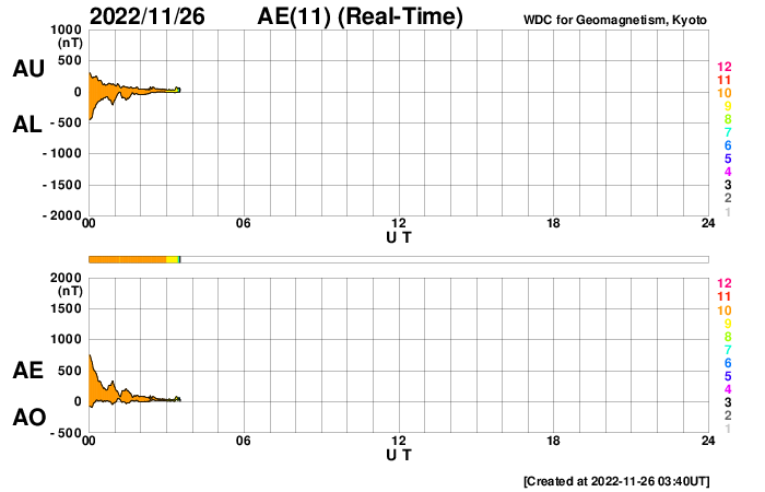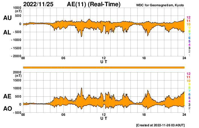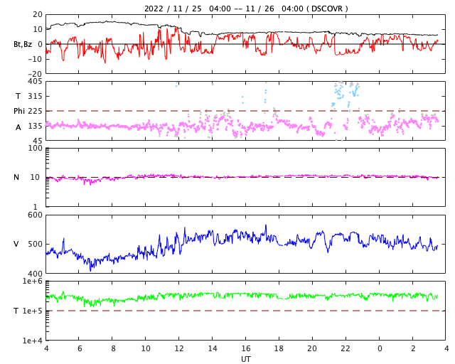 2022/11/26 12:46 更新 太陽風は500km/秒台に達し、磁気圏の活動も強まっています。 担当 篠原 太陽風の速度は、昨夜遅くに530km/秒まで高まり、 現在も500km/秒前後と高速の状態で推移しています。 SDO衛星AIA193の太陽コロナ写真では、 コロナホールは目立たなくなっていましたが、 前周期の高速風は残っていた様です。 太陽風の磁場強度は、 速度の高まりの前に15nTまで強まりましたが、 その後は下がって、 現在は6nTと平均的な状態に戻っています。 磁場の南北成分は、頻繁に南北に変化しています。 速度が高まっていることもあって、磁気圏の活動は強まり、 AE指数は800nT前後の中規模の変化が続いています。 現在は磁場強度が下がってきたので、 今後の活動は規模が小さくなりそうですが、 活動的な状態はどこまで続くでしょうか。 太陽は、SDO衛星のWebページの画像が停止していて、 掲載している可視光写真は昨夜の撮影です。 X線グラフは、C1.1の小規模フレアが1回発生した程度で、 太陽は穏やかな状態です。 ![]() SDO衛星による太陽の可視光写真。マウスの矢印を写真に重ねると、黒点番号付きの写真に切り替わります。 (c) SDO (NASA) ![]() DSCOVRが観測した太陽風の磁場(黒線は全体の強度、赤線は南北成分) 磁場の向き、プラズマの密度、速度、温度 (c) データ:NOAA/SWPC、作図:宇宙天気ニュース ![]() AE指数(速報値) 下段のAEグラフの値が高くなると、オーロラ活動が活発化しています。 (c) 京都大学WDC ![]() ![]() 27日の太陽周期に合わせた図 太陽が同じ面を地球に向けていた27日前の変化から、今後を予想することができます。 (c) 作図:宇宙天気ニュース
