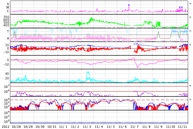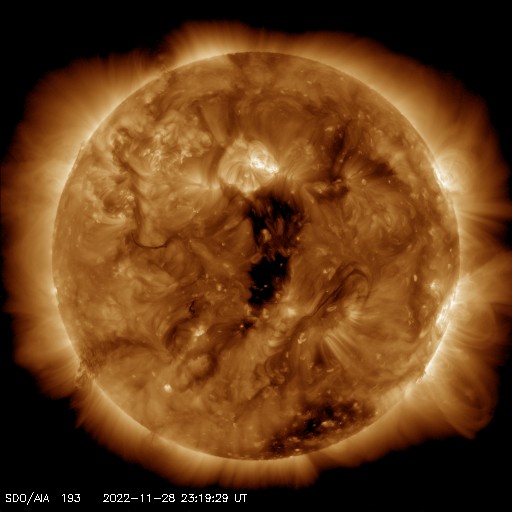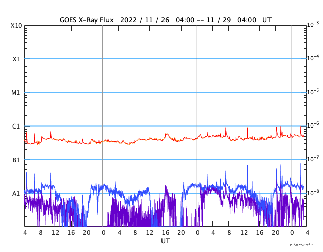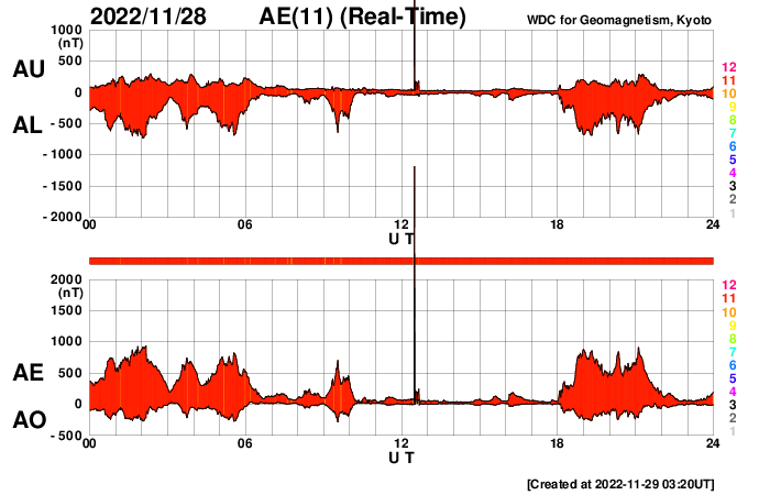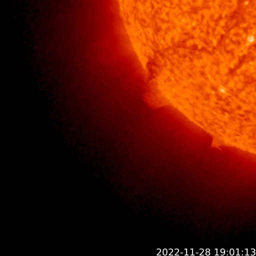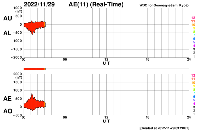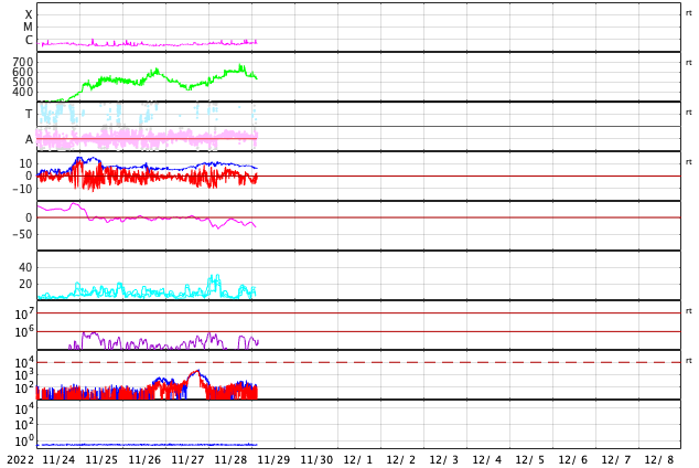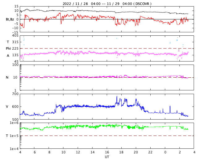 2022/11/29 12:22 更新 プロミネンス噴出が発生しています。太陽風は高速の状態が続いています。 担当 篠原 今朝、29日6時(世界時28日21時)頃から、 太陽の南東の端(左下)でプロミネンス噴出が発生しました。 GOES衛星SUVI 304の動画を掲載します。 CME(コロナ質量放出)は、 地球に対して横方向の噴出になるので、影響はありません。 太陽は、フレアの発生は少ない状態が続いていて、 先ほど、29日11時半(世界時29日2時半)に C1.0の小規模フレアが発生した程度です。 Cクラスに達するフレアは、25日のC1.1以来で、 4日ぶりです。 太陽風は、昨夜から今朝にかけて、 速度が600km/秒台に高まっています。 ただ、グラフの様子が微妙な印象で、 値としては正確ではないかもしれません。 グラフの後半で、速度は530km/秒に下がっていますが、 高速の状態は続いています。 太陽風の磁場強度は、 10nT程度に強まった状態が続いていましたが、 グラフの最後で6nTと平均的な値に下がっています。 南北成分は、グラフの前半は北寄り、 後半は南寄りとなっています。 AE指数は、グラフの中盤で一旦穏やかになり、 その後、800nTの中規模の変化が発生する様になっています。 現在の高速風はどこまで続くでしょうか。 SDO衛星AIA193を見ると、 中心部のコロナホールが西側に少し進んでいて、 明後日くらいからこの領域の影響が始まりそうです。 このまま高速の状態が続くのか、一旦下がるのか、 引き続き注目してください。