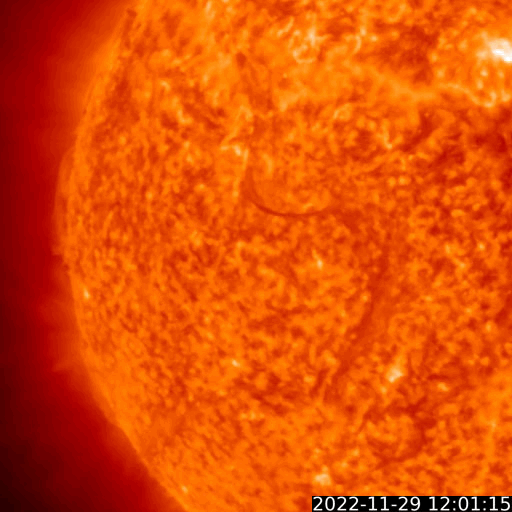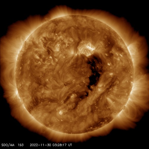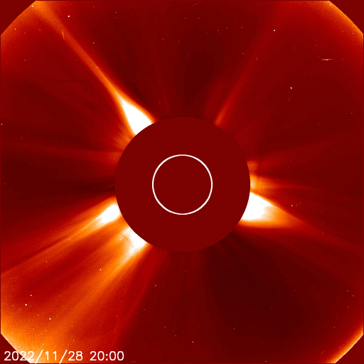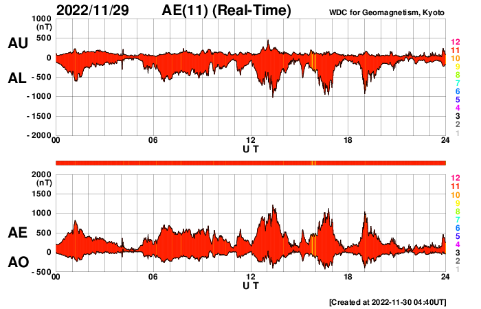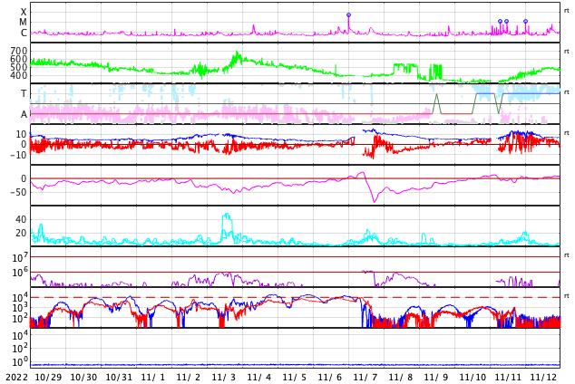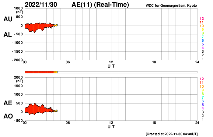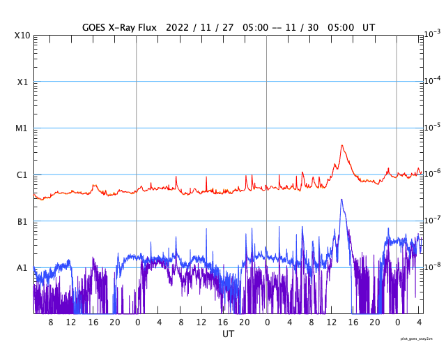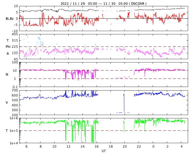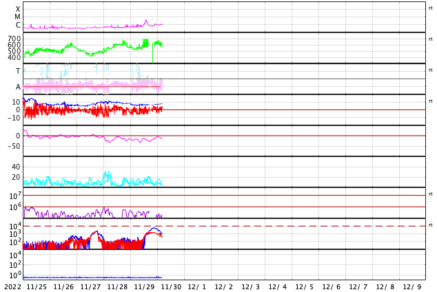 2022/11/30 13:47 更新 太陽風は速度が600km/秒台に高まり、磁気圏活動も強まりました。 担当 篠原 昨日のニュースで紹介した、 太陽の南東側(左下)に発生したプロミネンス噴出による CME(コロナ質量放出)の様子を、 SOHO衛星LASCO C2、C3の動画で紹介します。 太陽から左下に向かって勢い良くガスが噴出しています。 地球に対しては横向きなので、影響はありません。 そして、昨夜、29日22時(世界時29日13時)頃から 今朝、30日6時(世界時29日21時)頃にかけて、 太陽の東側を南北に長く伸びるダークフィラメントの 噴出が発生しました。 GOES衛星SUVI 304の動画を掲載します。 半日近い長さの画像を繋げたので、 ファイルサイズがだいぶ大きくなっています。 長大なフィラメントが複雑に動きながら飛び出して行きます。 フレアについては、西の端(右端)の3151黒点群で、 昨夜、29日22時(世界時29日13時)に C4.2の小規模フレアが発生しています。 X線グラフは、 グラフの最後で全体の強度が少し上がっています。 太陽の南東の端(左下)から活動的な領域が近付いていて、 その影響かもしれません。 太陽風は、昨夜遅くに速度が600km/秒に高まり、 最高で650km/秒まで高まって今朝までこの状態が続き、 グラフの最後で600km/秒台を割る程度に少し下がっています。 速度は高まった状態が続いています。 一方、太陽風の磁場強度は、 6nTから8nTへ次第に強まっています。 SDO衛星AIA193の太陽コロナ写真では、 中心部のコロナホールが西に進んでいますが、 このまま、この領域の影響に繋がって行きそうな様子です。 磁気圏も活動的な状態が続いていて、 AE指数は、1000nTに達する大きな変化が3回発生しています。 極域ではオーロラがにぎやかに発生していたのではないでしょうか。 この後も太陽風や磁気圏の変化に注目してください。 ![]() 昨日の朝に太陽の南東側に噴出したCME。 (c) SOHO衛星LASCO C2、C3 (ESA & NASA)、(動画加工 : 宇宙天気ニュース) ![]() 昨夜から今朝にかけて太陽の東側で発生したフィラメント噴出。 (c) GOES衛星SUVI 304 (NOAA)、(動画加工 : 宇宙天気ニュース) ![]() SDO衛星のAIA193カメラによる太陽コロナの様子 (c) SDO (NASA) ![]() SDO衛星による太陽の可視光写真。マウスの矢印を写真に重ねると、黒点番号付きの写真に切り替わります。 (c) SDO (NASA) ![]() GOES衛星の太陽X線強度。赤・橙 = 0.1〜0.8 nm、青・紫 = 0.05〜0.4 nm (c) データ:NOAA/SWPC、作図:宇宙天気ニュース ![]() DSCOVRが観測した太陽風の磁場(黒線は全体の強度、赤線は南北成分) 磁場の向き、プラズマの密度、速度、温度 (c) データ:NOAA/SWPC、作図:宇宙天気ニュース ![]() AE指数(速報値) 下段のAEグラフの値が高くなると、オーロラ活動が活発化しています。 (c) 京都大学WDC ![]() ![]() 27日の太陽周期に合わせた図 太陽が同じ面を地球に向けていた27日前の変化から、今後を予想することができます。 (c) 作図:宇宙天気ニュース