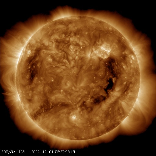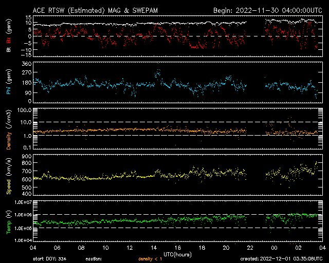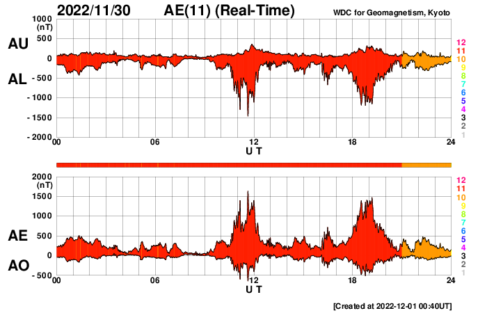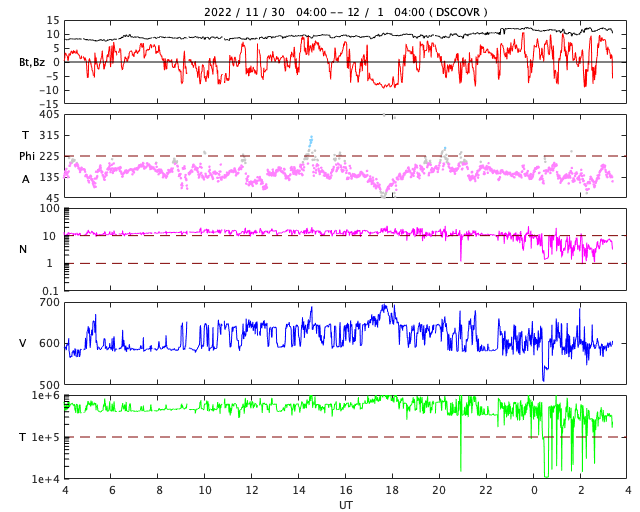 2022/12/ 1 12:31 更新 太陽風は600km/秒と高速で、磁気圏活動の強まりも発生しています。 担当 篠原 太陽風は、600km/秒前後と高速の状態が続いています。 DSCOVR衛星は速度のグラフが不安定になっているので、 ACE衛星のデータも参照して下さい。 磁場強度は、8nTからさらに強まっていて、 グラフの最後では12nTに達しています。 SDO衛星AIA193では、 注目していたコロナホールは西に半分ほど進み、 影響が始まる目安の位置に達しています。 太陽風はこの後も高速の風が続きそうです。 磁場の南北成分は、やや北寄りの傾向ですが、 南向きにも変化しています。 そのため、AE指数は、 変化が大きくなったり小さくなったりしています。 活発な時は1500nTに達する大規模な変化になっているので、 極域では激しいオーロラが見られたのではないでしょうか。 高速の太陽風はどこまで続くでしょうか。 太陽は、南西の端(右下)に達した3151黒点群と、 南東の端(左下)の新しい領域で、 C1〜3の小規模フレアが10回近く発生しています。 可視光写真では、南東の端には新しい黒点も見えています。 どの様な領域でしょうか。 昨日のニュースで紹介したフィラメント噴出では、 目立つ規模のCME(コロナ質量放出)は発生していませんでした。 ![]() SDO衛星のAIA193カメラによる太陽コロナの様子 (c) SDO (NASA) ![]() SDO衛星による太陽の可視光写真。マウスの矢印を写真に重ねると、黒点番号付きの写真に切り替わります。 (c) SDO (NASA) ![]() DSCOVRが観測した太陽風の磁場(黒線は全体の強度、赤線は南北成分) 磁場の向き、プラズマの密度、速度、温度 (c) データ:NOAA/SWPC、作図:宇宙天気ニュース ![]() ACEが観測した太陽風の磁場(1番上の枠、白線は全体の強度、赤線は南北成分) および、太陽風の密度(3番目の橙線)、速度(4番目の黄線) (c) NOAA/SWPC ![]() AE指数(速報値) 下段のAEグラフの値が高くなると、オーロラ活動が活発化しています。 (c) 京都大学WDC ![]() ![]() 27日の太陽周期に合わせた図 太陽が同じ面を地球に向けていた27日前の変化から、今後を予想することができます。 (c) 作図:宇宙天気ニュース