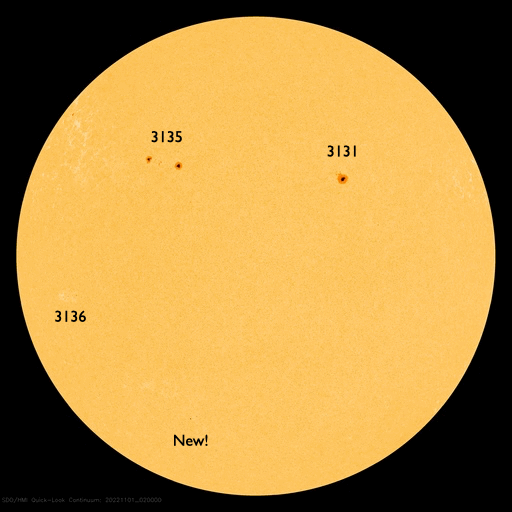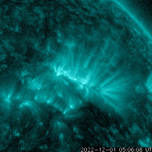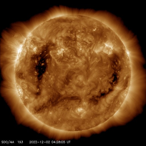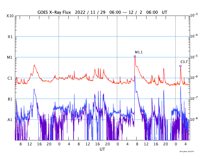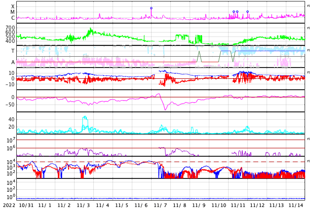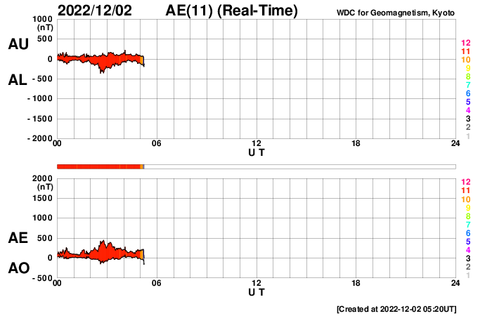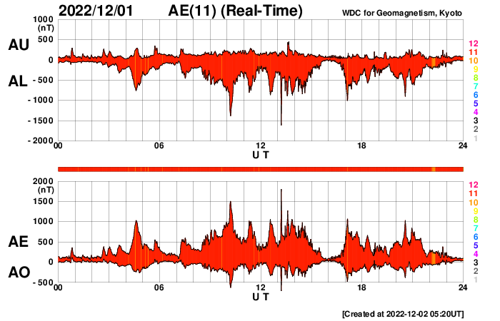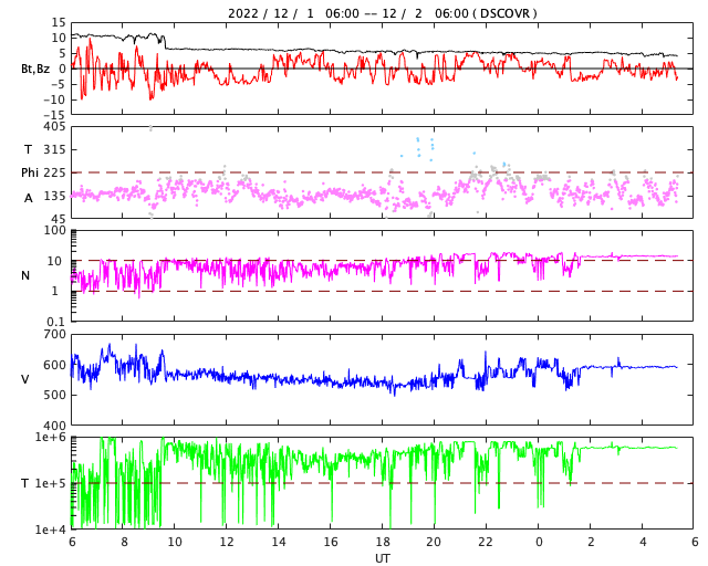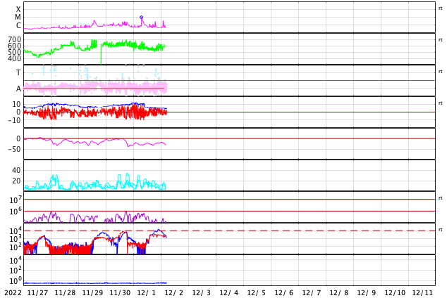 2022/12/ 2 14:39 更新 高速の太陽風が続き、磁気圏も活動的です。11月の黒点相対数は 77.6 でした。 担当 篠原 WDC-SILSOより、11月の黒点相対数は 77.6 と発表されました。 9月、10月と95を超える値になっていたのですが、 11月は下がっています。 毎日の値を見ると、 11月の前半は90前後が続いていたのですが、 後半は50前後に下がっていて、 全体として平均が70台になった様です。 前の周期の第24期も、 2012年頃は50〜100の間を上下していて、 推移としては同じ様な状況と言えるかもしれません。 その一方、2011年後半の様な100を超える変化はまだ起きておらず、 今後に注目というところです。 太陽は、昨夕、1日16時(世界時1日7時)に、 北西(右上)の3152黒点群でM1.0の中規模フレアが発生しました。 Mクラスのフレアの発生は、11月19日のM1.6以来12日ぶりです。 また、南東の端(左下)に現れた3153黒点群で、 C1〜3の小規模フレアが5回ほど発生しています。 この領域の今後の活動に注目してください。 太陽風は、速度のグラフが不安定になっていますが、 550〜600km/秒の高速風が続いているようです。 磁場強度は、グラフの前半で10nTから6nTに急に下がり、 その後5nTと平均的な値まで下がっています。 磁場の南北成分は、南北に細かく変化していて、 磁気圏の活動は活発な状態が続いています。 AE指数は1000nTに達する大きな変化が繰り返し発生しています。 ただ、グラフの最後は変化が少なくなっていて、 太陽風の磁場強度が下がるとともに、 南向きの変化が少なくなっていることが影響している様です。 SDO衛星AIA193は、 中心部の南側を東西にやや淡いコロナホールが伸び、 東側には縦に濃いコロナホールが広がっています。 太陽風は、この後も速度が高まった状態が続くかもしれません。