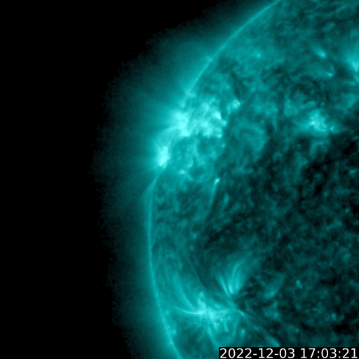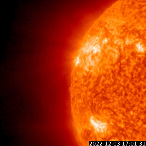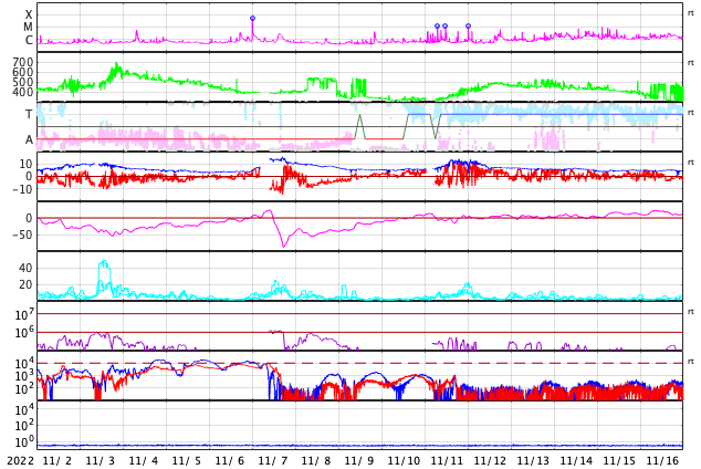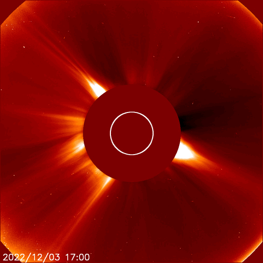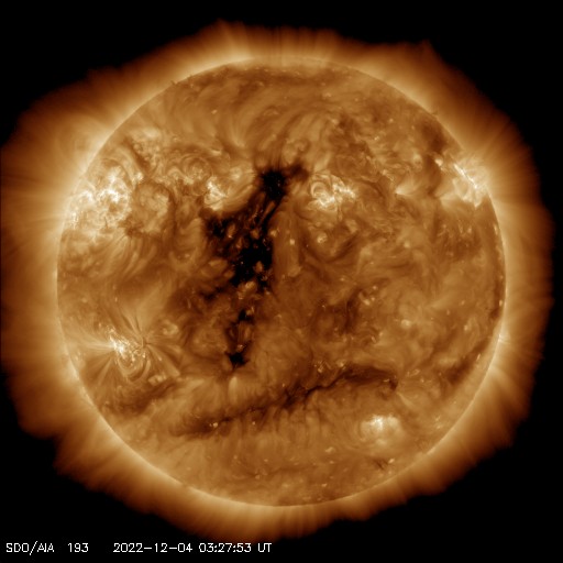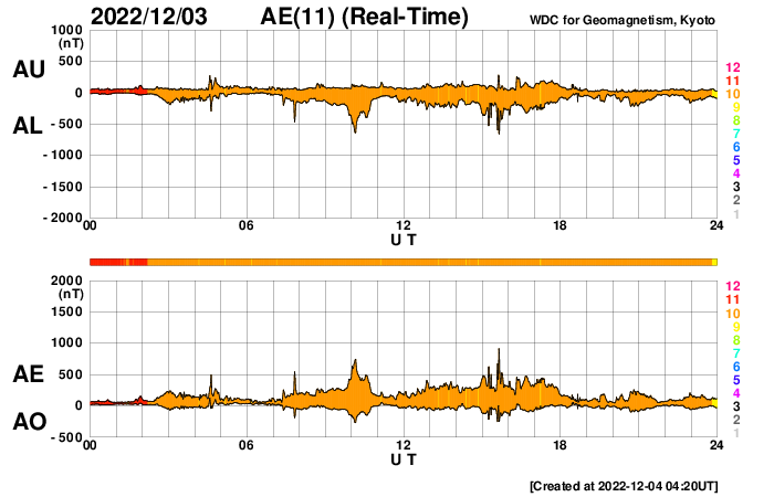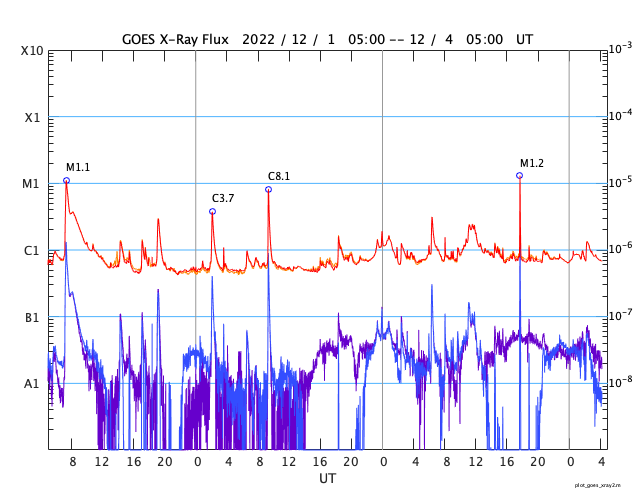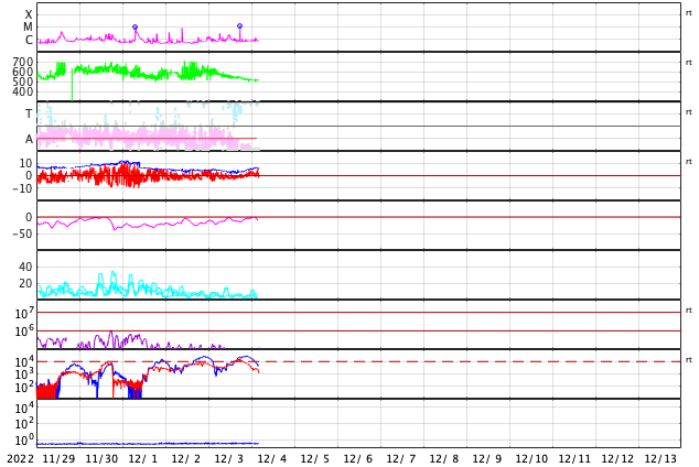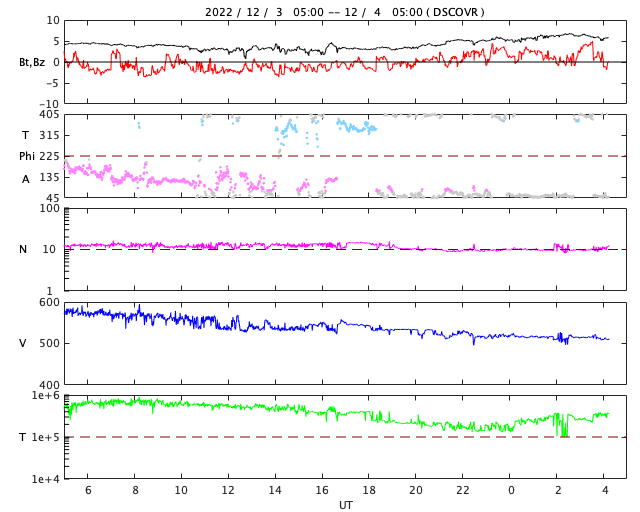 2022/12/ 4 13:28 更新 M1.2の中規模フレアが発生しました。高速風は続いていますが、速度は下がっています。 担当 篠原 太陽で、今日未明、4日2時半(世界時3日17時半)に、 北東の端(左上)に現れた3157黒点群で、 M1.2の中規模フレアが発生しました。 GOES衛星SUVI 131とSUVI 304の動画を掲載します。 フレアは、短い時間輝くタイプで、 131の動画では一瞬だけ明るく見えています。 一方、304の動画では、フレアに伴ってコロナのガスが 太陽の左側に噴き出す様子が見えています。 SOHO衛星LASCO C2、C3では、 CME(コロナ質量放出)が撮影されています。 飛び出すガスは淡く、横方向なので、 地球への影響はありません。 太陽では、この他にもあちこちの黒点群で、 C1〜3の小規模フレアが10回程度発生しています。 この後も活動は続くでしょうか。 太陽風は、600km/秒程度だった速度がゆっくりと下がり、 現在は510km/秒になっています。 高速の状態は続いています。 磁場強度は、5nTから3nTへ下がり、 グラフの後半で再び6nT程度に上がっています。 磁場の南北成分は、 弱い南寄りから弱い北寄りに変化している様です。 AE指数は、グラフの途中までは 300〜500nTの小規模の変化が続いていますが、 最後は変化が小さくなっています。 この後も太陽風の速度は下がって行くのでしょうか。 SDO衛星AIA193の太陽コロナ写真では、 縦に伸びるコロナホールが、太陽の中心線に達しています。 3日後くらいからは、 この領域の影響で太陽風は高速になりそうです。