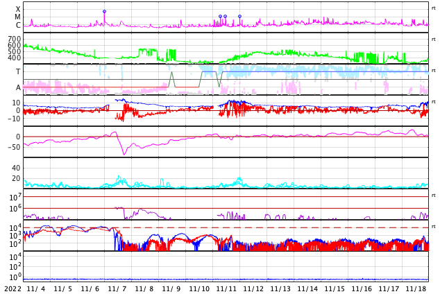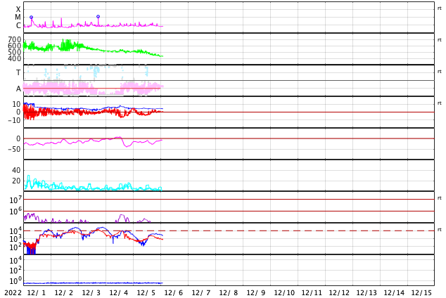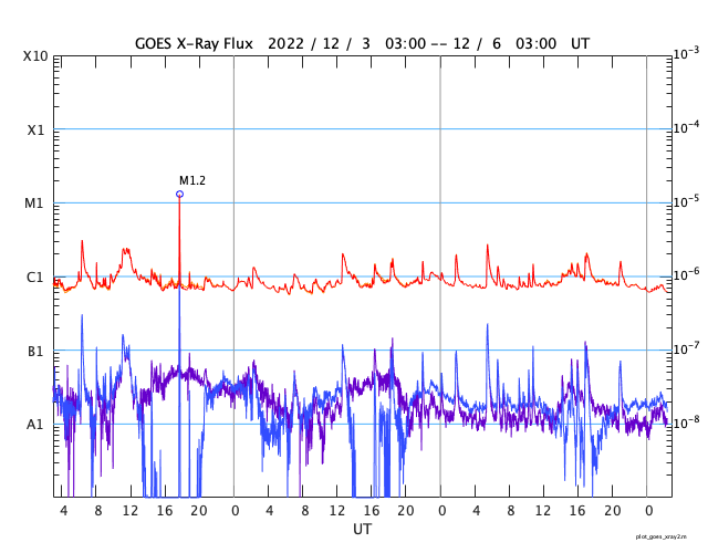 GOES衛星の太陽X線強度。赤・橙 = 0.1〜0.8 nm、青・紫 = 0.05〜0.4 nm (c) データ:NOAA/SWPC、作図:宇宙天気ニュース ![]() | ||||||||||||||||||||||||||||||||||||||||||||||||||||||||||||||||||||||||||||||||||||||||||||||||||||||||||||||||||||||||||||||||||||||||||||||||||||||||||||||||||||||||||||||||||||||||||||||||||||||||||||||||||||||||||||||||||||