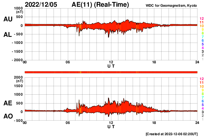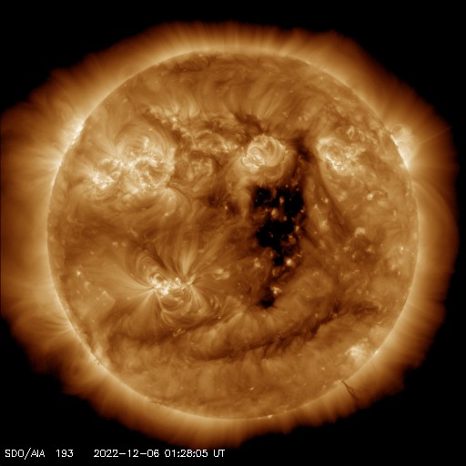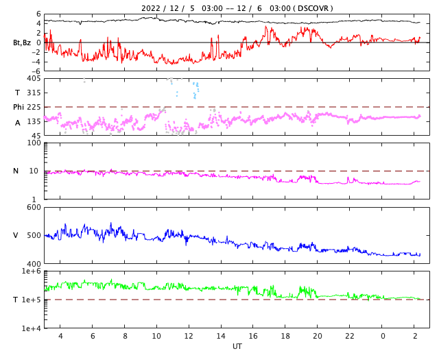 2022/12/ 6 11:31 更新 太陽風は平均的な速度に戻っています。磁気圏は穏やかです。 担当 篠原 太陽風は、昨夜まで500km/秒の高速風が続きましたが、 その後速度が次第に低下して、 現在は430km/秒と平均的な速さに戻っています。 磁場強度は5nTと平均的な値で安定しています。 南北成分は昨日の午後から深夜にかけて南向きになり、 -3〜 -5nTの状態が半日ほど続きました。 このため磁気圏の活動もやや強まって、 AE指数はグラフの中盤で 500nT前後の小規模の変化が続いています。 そして、今日に入る頃から 磁場の南北成分は0nT付近で小さく変化する様になり、 磁気圏も穏やかになって、 AE指数は後半から変化が見られなくなっています。 SDO衛星AIA193では、 中心部のコロナホールがさらに西に進んでいます。 明日か明後日くらいから、 この領域の影響で太陽風の速度が再び高まりそうです。 太陽は、3153黒点群と3158黒点群で、 C1〜2の小さい小規模フレアが10回程度発生しています。 今のところ、活動の規模は安定している様です。 ![]() SDO衛星のAIA193カメラによる太陽コロナの様子 (c) SDO (NASA) ![]() SDO衛星による太陽の可視光写真。マウスの矢印を写真に重ねると、黒点番号付きの写真に切り替わります。 (c) SDO (NASA) ![]() DSCOVRが観測した太陽風の磁場(黒線は全体の強度、赤線は南北成分) 磁場の向き、プラズマの密度、速度、温度 (c) データ:NOAA/SWPC、作図:宇宙天気ニュース ![]() AE指数(速報値) 下段のAEグラフの値が高くなると、オーロラ活動が活発化しています。 (c) 京都大学WDC ![]() ![]() 27日の太陽周期に合わせた図 太陽が同じ面を地球に向けていた27日前の変化から、今後を予想することができます。 (c) 作図:宇宙天気ニュース