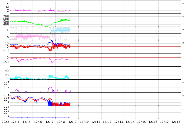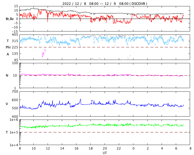 2022/12/ 8 12:41 太陽風はやや高速になっています。磁場が南向きに強まり、磁気圏の活動も活発になりました。